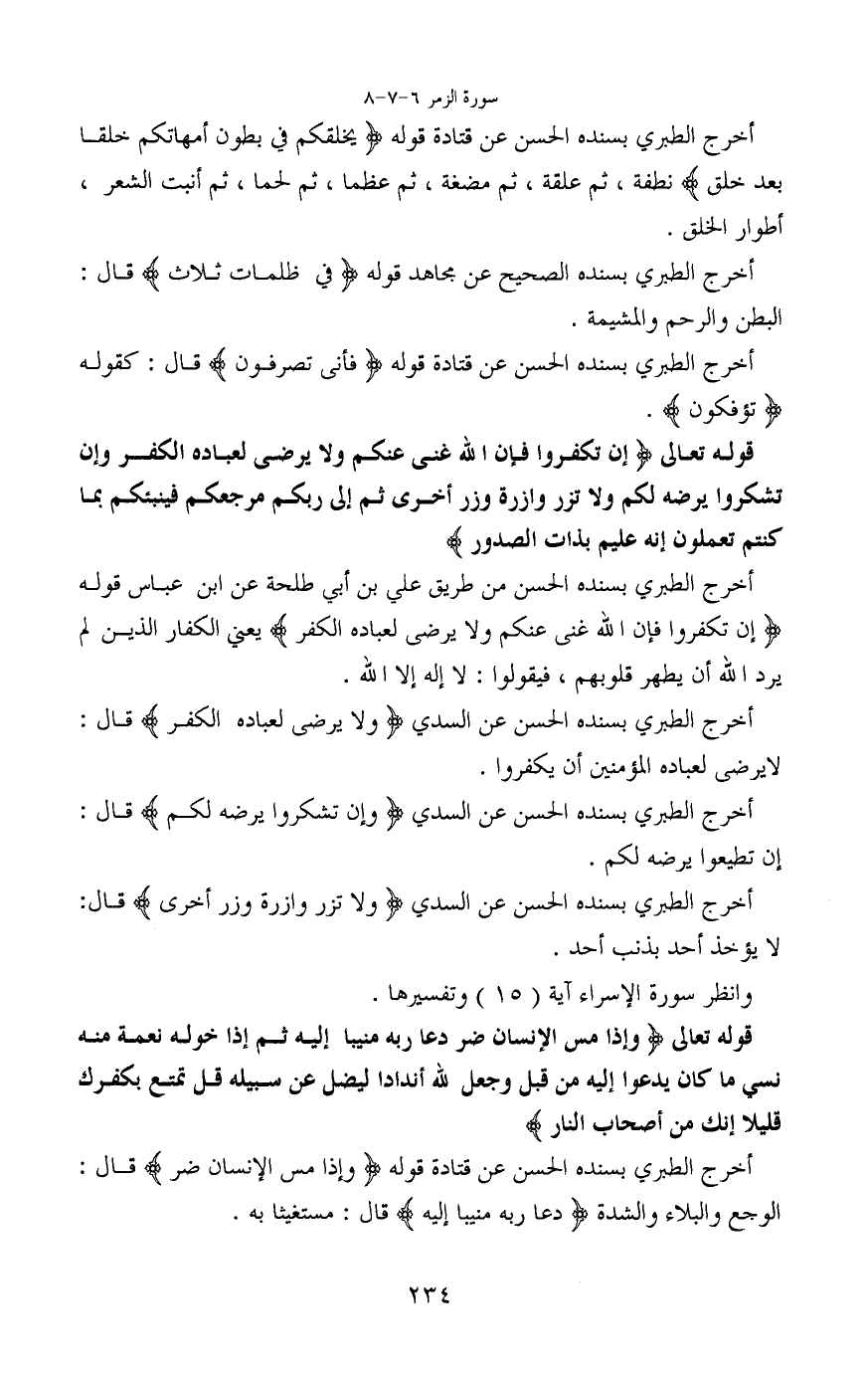 قوله تعالى (إِنْ تَكْفُرُوا فَإِنَّ اللَّهَ غَنِيٌّ عَنْكُمْ وَلَا يَرْضَى لِعِبَادِهِ الْكُفْرَ وَإِنْ تَشْكُرُوا يَرْضَهُ لَكُمْ وَلَا تَزِرُ وَازِرَةٌ وِزْرَ أُخْرَى ثُمَّ إِلَى رَبِّكُمْ مَرْجِعُكُمْ فَيُنَبِّئُكُمْ بِمَا كُنْتُمْ تَعْمَلُونَ إِنَّهُ عَلِيمٌ بِذَاتِ الصُّدُورِ)
