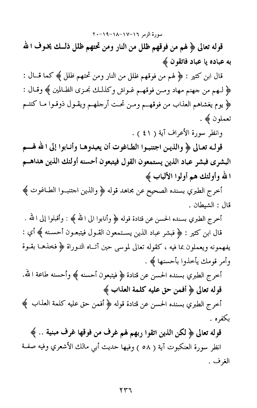 قوله تعالى (لَهُمْ مِنْ فَوْقِهِمْ ظُلَلٌ مِنَ النَّارِ وَمِنْ تَحْتِهِمْ ظُلَلٌ ذَلِكَ يُخَوِّفُ اللَّهُ بِهِ عِبَادَهُ يَا عِبَادِ فَاتَّقُونِ)