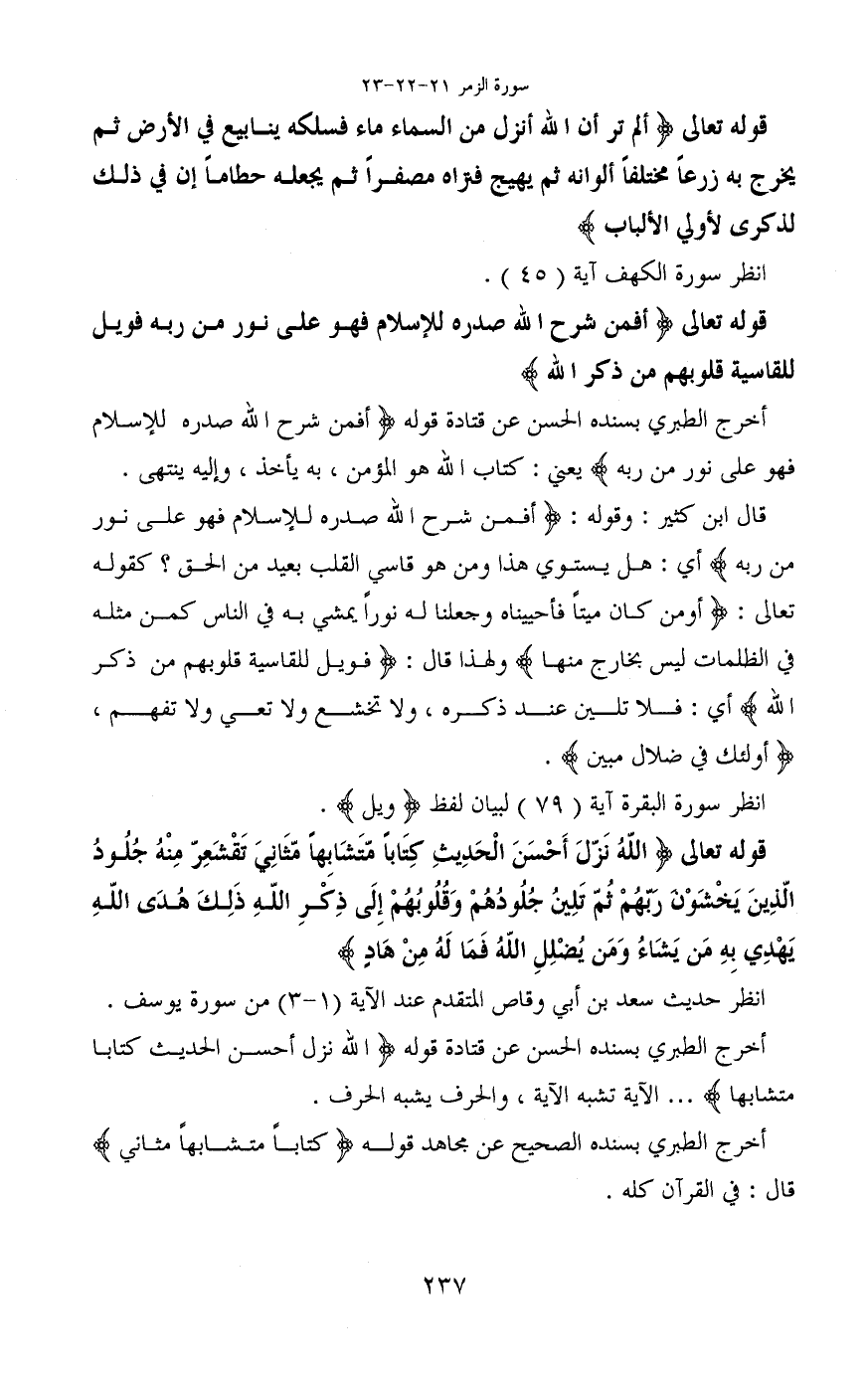 أخرج الطبري بسنده الحسن عن قتادة قوله (أفمن شرح الله صدره للإسلام فهو على نور من ربه) يعني: كتاب الله هو المؤمن، به يأخذ، وإليه ينتهي.