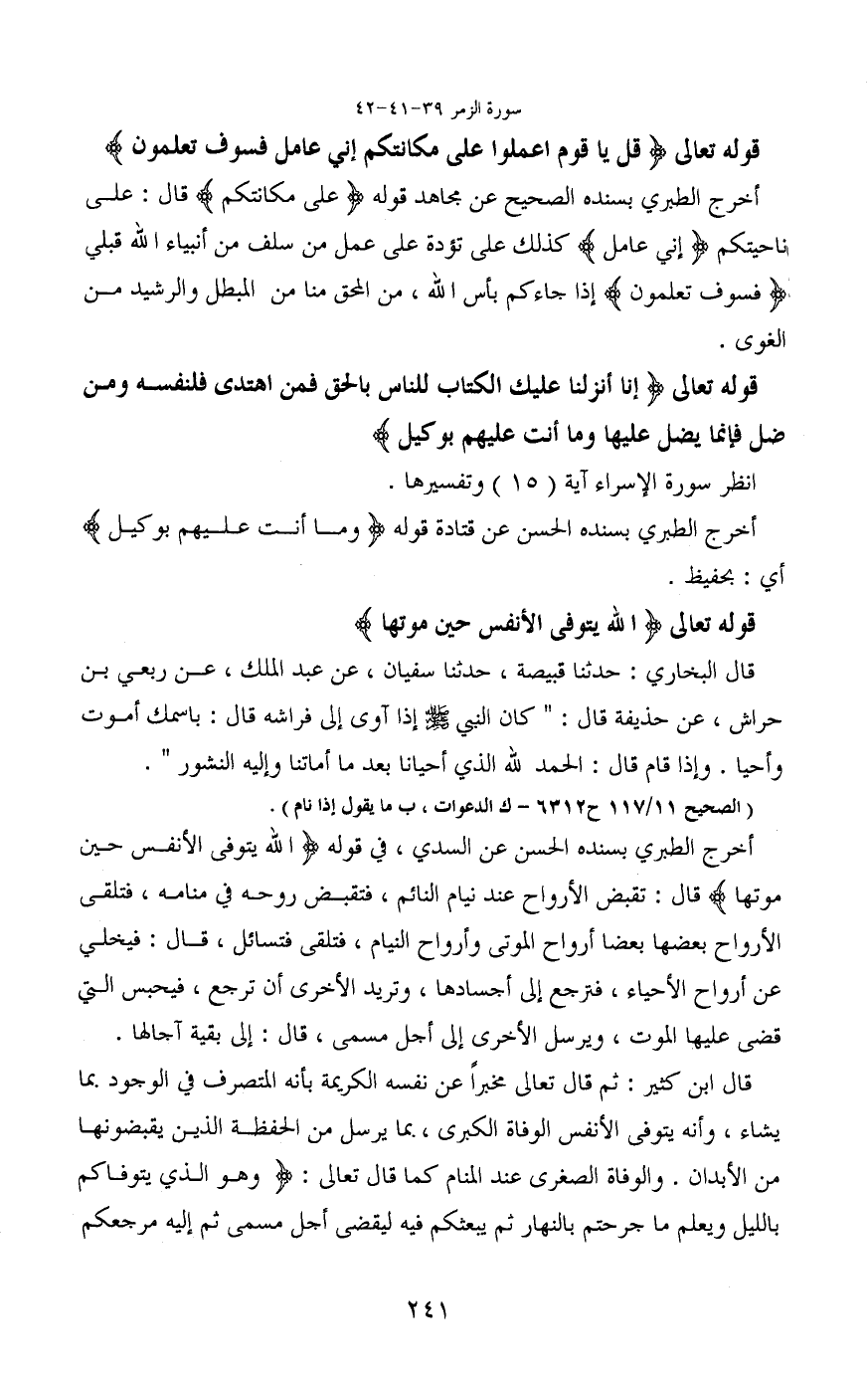 أخرج الطبري بسنده الحسن عن السدي، في قوله (الله يتوفى الأنفس حين موتها) قال: تقبض الأرواح عند نيام النائم، فتقبض روحه في منامه، فتلقى الأرواح بعضها بعضاً أرواح الموتى وأرواح النيام، فتلقى فتسائل، قال: فيخلي عن أرواح الأحياء، فترجع إلى أجسادها، وتريد الأخرى أن ترجع، فيحبس التي قضى عليها الموت، ويرسل الأخرى إلى أجل مسمى، قال: إلى بقية آجالها.