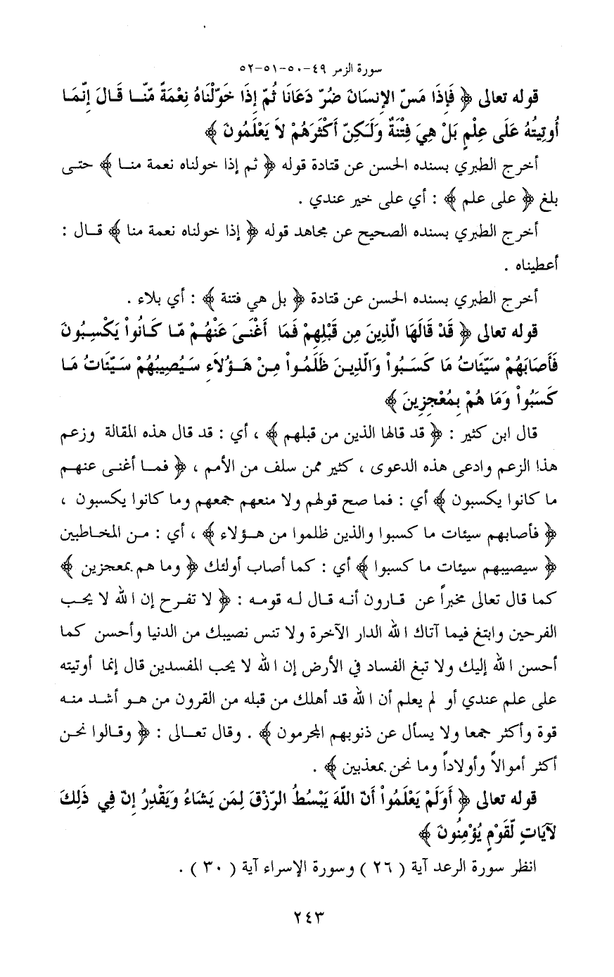 قال ابن كثير: (قد قالها الذين من قبلهم) ، أي: قد قال هذه المقالة وزعم هذا الزعم وادعى هذه الدعوى، كثير ممن سلف من الأمم، (فما أغنى عنهم ما كانوا يكسبون) أي: فما صح قولهم ولا منعهم جمعهم وما كانوا يكسبون، (فأصابهم سيئات ما كسبوا والذين ظلموا من هؤلاء) ، أي: من المخاطبين (سيصيبهم سيئات ما كسبوا) أي: كما أصاب أولئك (وما هم بمعجزين) كما قال تعالى مخبراً عن قارون أنه قال له قومه: (لَا تَفْرَحْ إِنَّ اللَّهَ لَا يُحِبُّ الْفَرِحِينَ (76) وَابْتَغِ فِيمَا آَتَاكَ اللَّهُ الدَّارَ الْآَخِرَةَ وَلَا تَنْسَ نَصِيبَكَ مِنَ الدُّنْيَا وَأَحْسِنْ كَمَا أَحْسَنَ اللَّهُ إِلَيْكَ وَلَا تَبْغِ الْفَسَادَ فِي الْأَرْضِ إِنَّ اللَّهَ لَا يُحِبُّ الْمُفْسِدِينَ (77) قَالَ إِنَّمَا أُوتِيتُهُ عَلَى عِلْمٍ عِنْدِي أَوَلَمْ يَعْلَمْ أَنَّ اللَّهَ قَدْ أَهْلَكَ مِنْ قَبْلِهِ مِنَ الْقُرُونِ مَنْ هُوَ أَشَدُّ مِنْهُ قُوَّةً وَأَكْثَرُ جَمْعًا وَلَا يُسْأَلُ عَنْ ذُنُوبِهِمُ الْمُجْرِمُونَ) . وقال تعالى: (وقالوا نحن أكثر أموالاً وأولاداً وما نحن بمعذبين) .