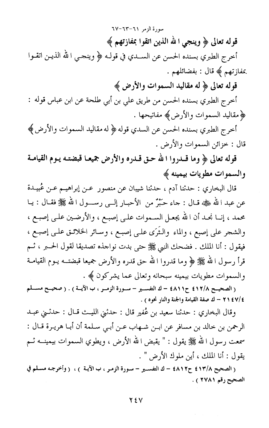 قوله تعالى (وَمَا قَدَرُوا اللَّهَ حَقَّ قَدْرِهِ وَالْأَرْضُ جَمِيعًا قَبْضَتُهُ يَوْمَ الْقِيَامَةِ وَالسَّماوَاتُ مَطْوِيَّاتٌ بِيَمِينِهِ)