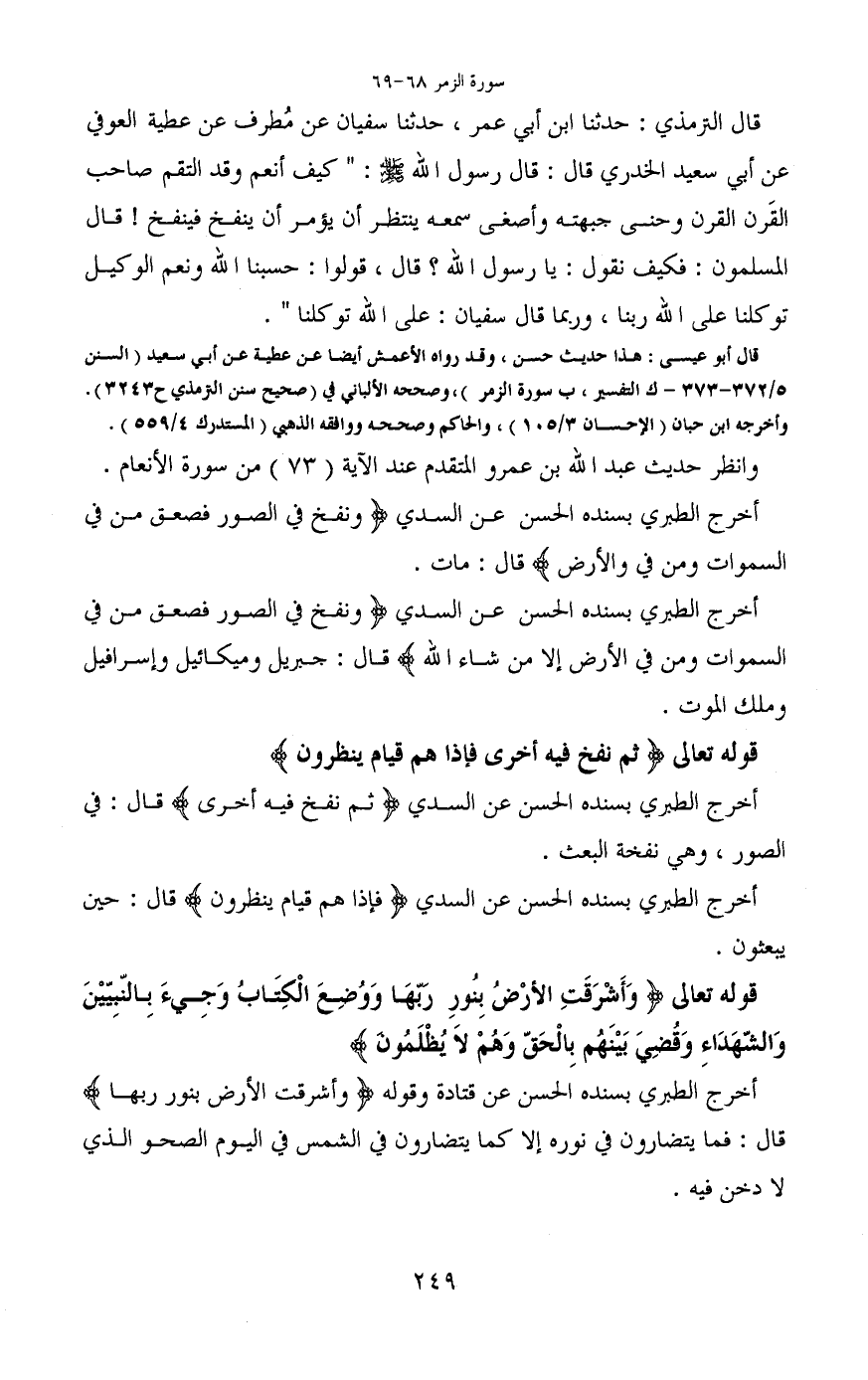 قوله تعالى (وَأَشْرَقَتِ الْأَرْضُ بِنُورِ رَبِّهَا وَوُضِعَ الْكِتَابُ وَجِيءَ بِالنَّبِيِّينَ وَالشُّهَدَاءِ وَقُضِيَ بَيْنَهُمْ بِالْحَقِّ وَهُمْ لَا يُظْلَمُونَ)