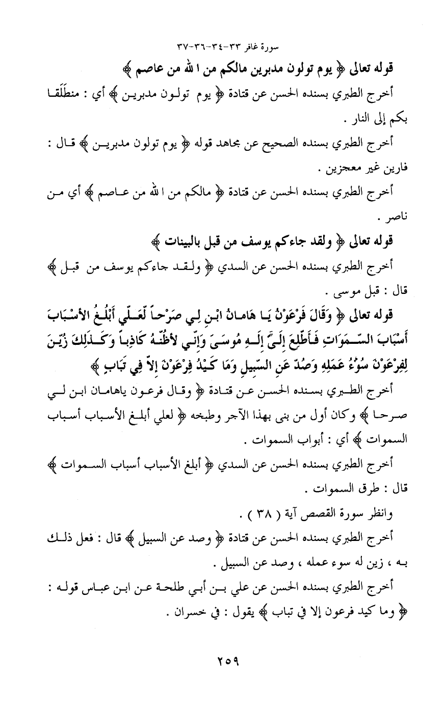 قوله تعالى (وَقَالَ فِرْعَوْنُ يَا هَامَانُ ابْنِ لِي صَرْحًا لَعَلِّي أَبْلُغُ الْأَسْبَابَ (36) أَسْبَابَ السَّمَاوَاتِ فَأَطَّلِعَ إِلَى إِلَهِ مُوسَى وَإِنِّي لَأَظُنُّهُ كَاذِبًا وَكَذَلِكَ زُيِّنَ لِفِرْعَوْنَ سُوءُ عَمَلِهِ وَصُدَّ عَنِ السَّبِيلِ وَمَا كَيْدُ فِرْعَوْنَ إِلَّا فِي تَبَابٍ)