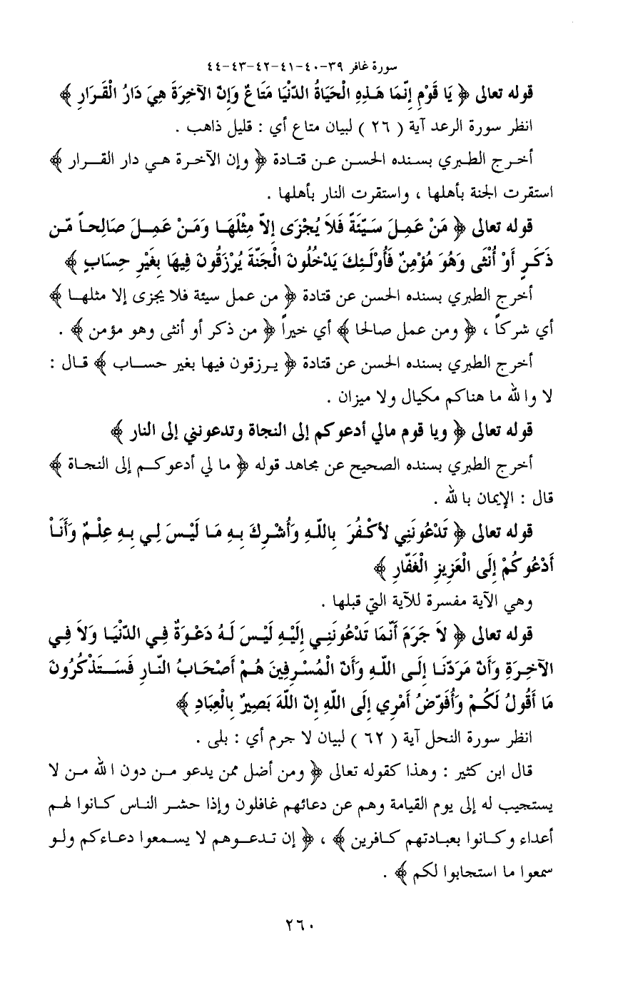 قوله تعالى (لَا جَرَمَ أَنَّمَا تَدْعُونَنِي إِلَيْهِ لَيْسَ لَهُ دَعْوَةٌ فِي الدُّنْيَا وَلَا فِي الْآَخِرَةِ وَأَنَّ مَرَدَّنَا إِلَى اللَّهِ وَأَنَّ الْمُسْرِفِينَ هُمْ أَصْحَابُ النَّارِ (43) فَسَتَذْكُرُونَ مَا أَقُولُ لَكُمْ وَأُفَوِّضُ أَمْرِي إِلَى اللَّهِ إِنَّ اللَّهَ بَصِيرٌ بِالْعِبَادِ)