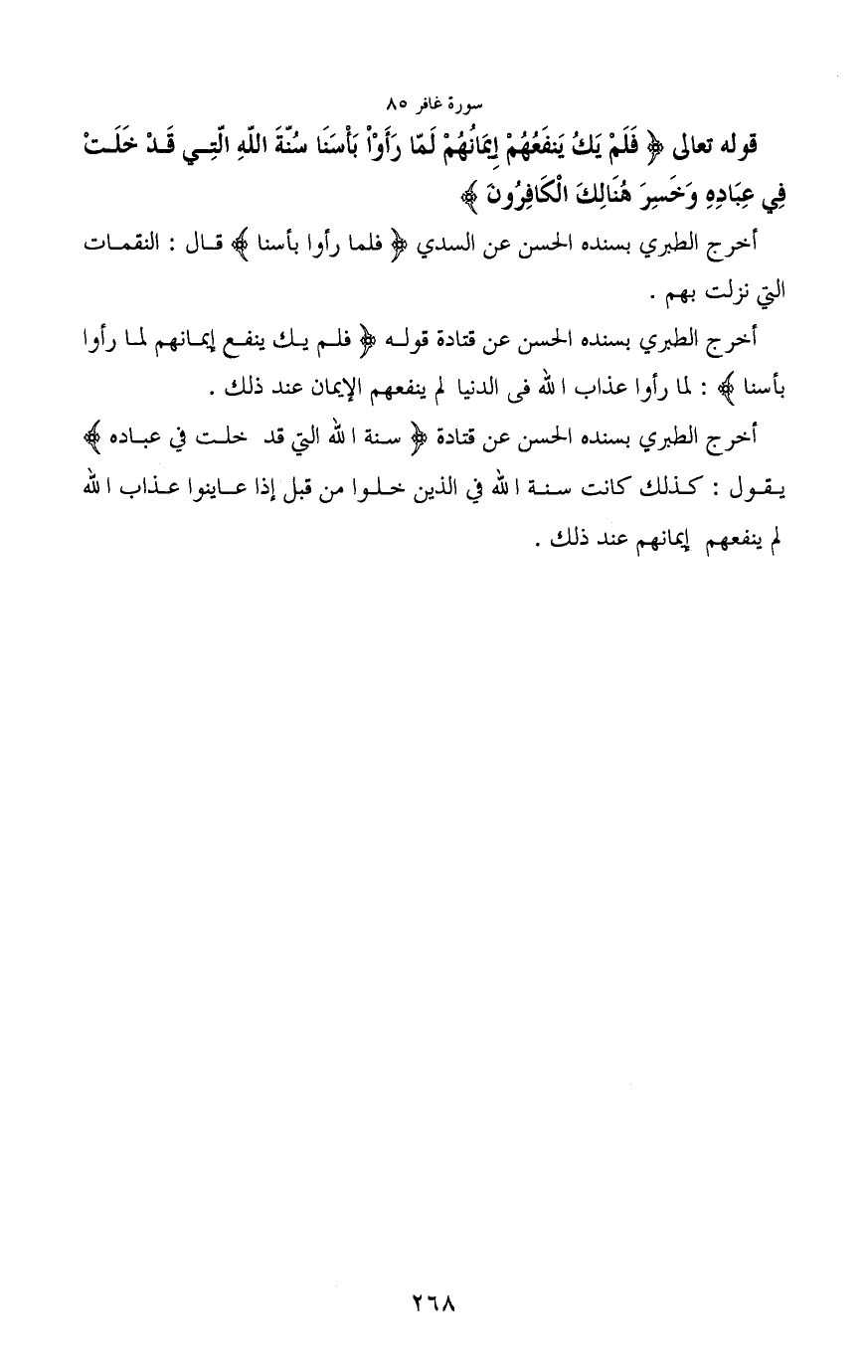 أخرج الطبري بسنده الحسن عن قتادة قوله (فلم يك ينفع إيمانهم لما رأوا بأسنا) : لما رأوا عذاب الله في الدنيا لم ينفعهم الإيمان عند ذلك.