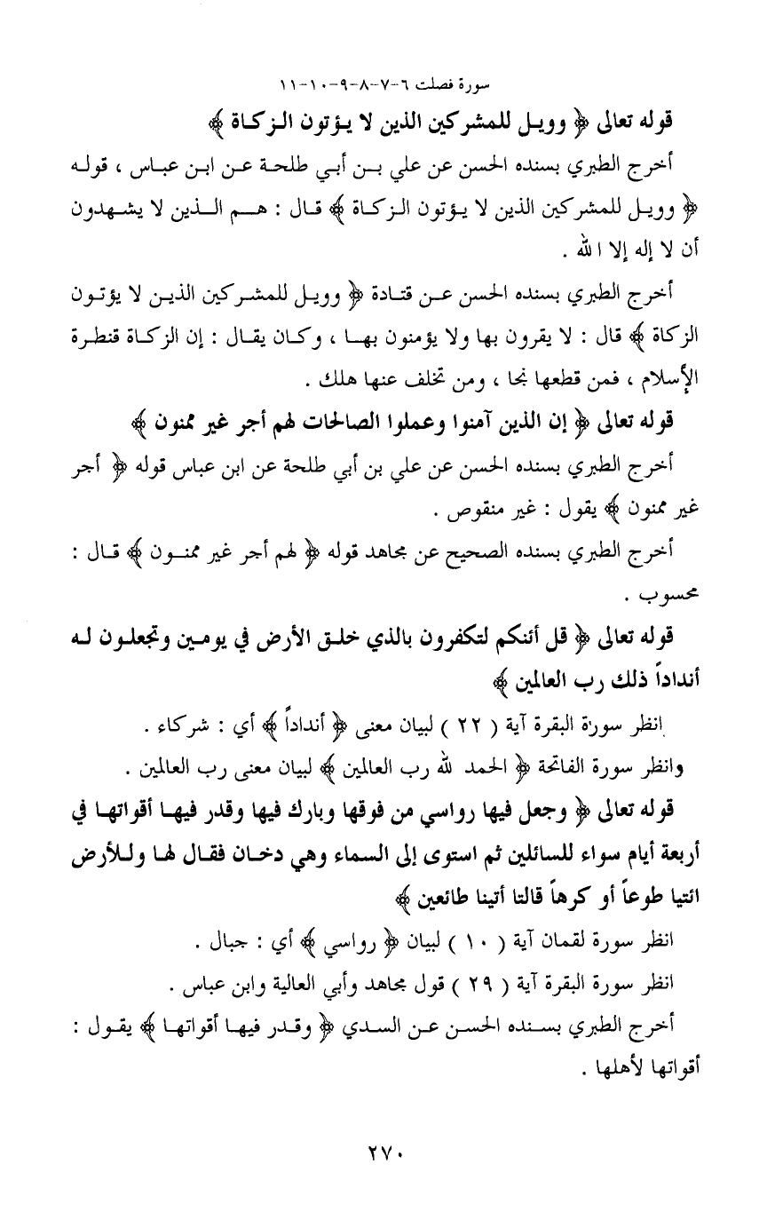 أخرج الطبري بسنده الحسن عن قتادة (وَوَيْلٌ لِلْمُشْرِكِينَ (6) الَّذِينَ لَا يُؤْتُونَ الزَّكَاةَ) قال: لا يقرون بها ولا يؤمنون بها، وكان يقال: إن الزكاة قنطرة الإسلام، فمن قطعها نجا، ومن تخلف عنها هلك.