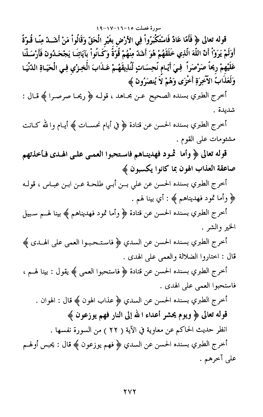 قوله تعالى (فَأَمَّا عَادٌ فَاسْتَكْبَرُوا فِي الْأَرْضِ بِغَيْرِ الْحَقِّ وَقَالُوا مَنْ أَشَدُّ مِنَّا قُوَّةً أَوَلَمْ يَرَوْا أَنَّ اللَّهَ الَّذِي خَلَقَهُمْ هُوَ أَشَدُّ مِنْهُمْ قُوَّةً وَكَانُوا بِآَيَاتِنَا يَجْحَدُونَ (15) فَأَرْسَلْنَا عَلَيْهِمْ رِيحًا صَرْصَرًا فِي أَيَّامٍ نَحِسَاتٍ لِنُذِيقَهُمْ عَذَابَ الْخِزْيِ فِي الْحَيَاةِ الدُّنْيَا وَلَعَذَابُ الْآَخِرَةِ أَخْزَى وَهُمْ لَا يُنْصَرُونَ)