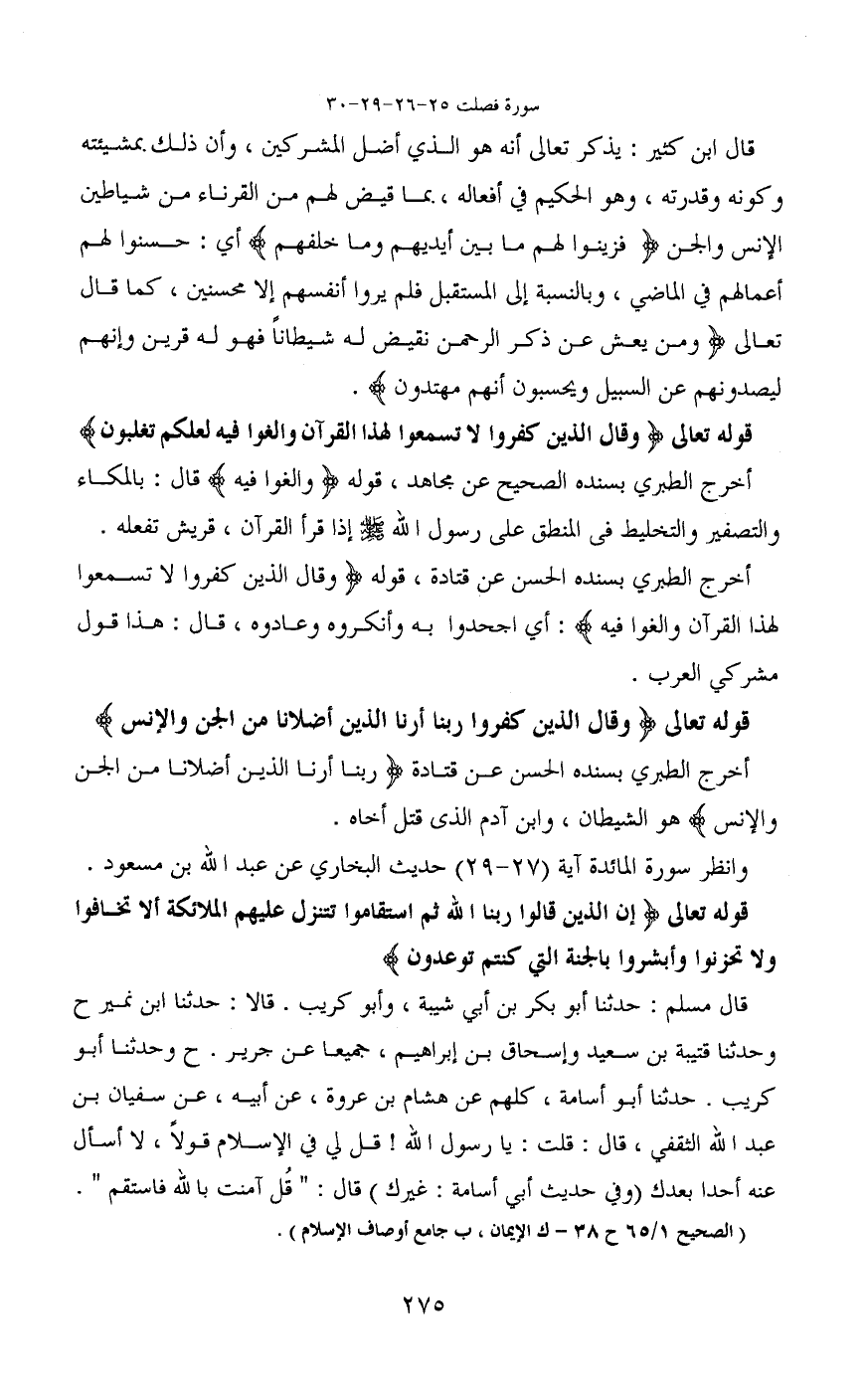 قال مسلم: حدثنا أبو بكر بن أبي شيبة، وأبو كريب. قالا: حدثنا ابن نمير ح وحدثنا قتيبة بن سعيد وإسحاق بن إبراهيم، جميعا عن جرير. ح وحدثنا أبو كريب. حدثنا أبو أسامة، كلهم عن هشام بن عروة، عن أبيه، عن سفيان بن عبد الله الثقفي، قال: قلت: يا رسول الله! قل لي في الإسلام قولاً، لا أسأل عنه أحداً بعدك (وفي حديث أبي أسامة: غيرك) قال: "قل آمنت بالله فاستقم".