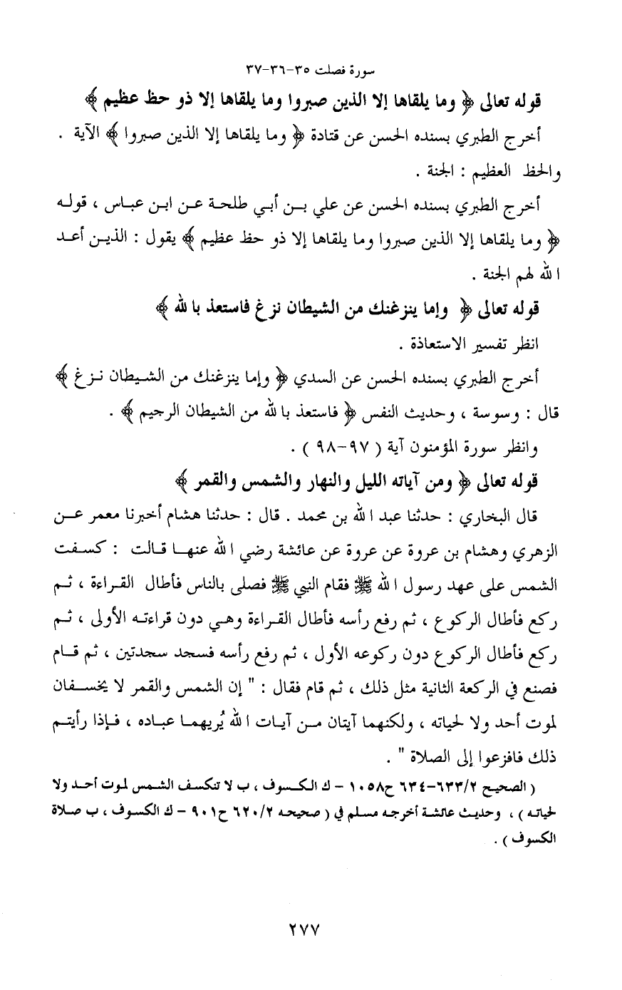 قال البخاري: حدثنا عبد الله بن محمد. قال: حدثنا هشام أخبرنا معمر عن الزهري وهشام بن عروة عن عروة عن عائشة رضي الله عنها قالت: كسفت الشمس على عهد رسول الله - صَلَّى اللَّهُ عَلَيْهِ وَسَلَّمَ - فقام النبي - صَلَّى اللَّهُ عَلَيْهِ وَسَلَّمَ - فصلى بالناس فأطال القراءة، ثم ركع فأطال الركوع، ثم رفع رأسه فأطال القراءة وهى دون قراءته الأولى، ثم ركع فأطال الركوع دون ركوعه الأول، ثم رفع رأسه فسجد سجدتين، ثم قام فصنع في الركعة الثانية مثل ذلك، ثم قام فقال: "إن الشمس والقمر لا يخسفان لموت أحد ولا لحياته، ولكنهما آيتان من آيات الله يُريهما عباده، فإذا رأيتم ذلك فافزعوا إلى الصلاة".
