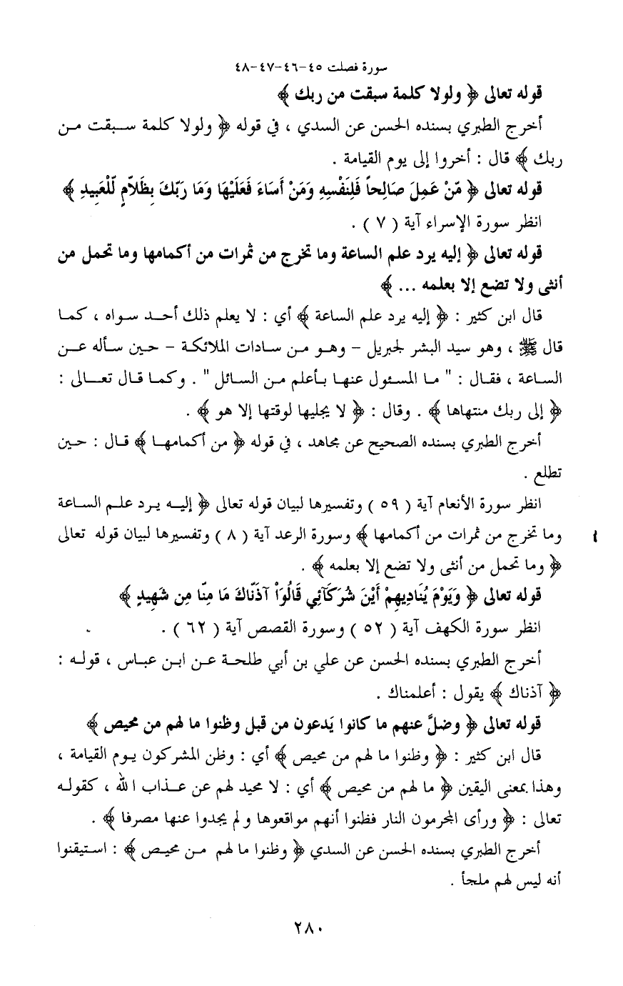 قال ابن كثير: (إليه يرد علم الساعة) أي: لا يعلم ذلك أحد سواه، كما قال - صَلَّى اللَّهُ عَلَيْهِ وَسَلَّمَ -، وهو سيد البشر لجبريل -وهو من سادات الملائكة- حين سأله عن الساعة، فقال: "ما المسئول عنها بأعلم من السائل". وكما قال تعالى: (إلى ربك منتهاها) . وقال: (لا يجليها لوقتها إلا هو) .