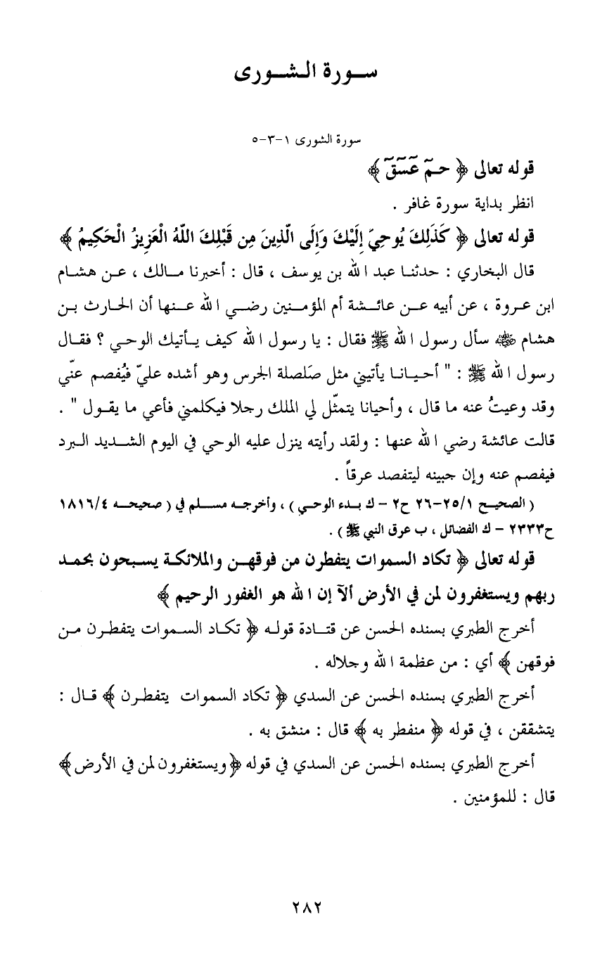 قوله تعالى (كَذَلِكَ يُوحِي إِلَيْكَ وَإِلَى الَّذِينَ مِنْ قَبْلِكَ اللَّهُ الْعَزِيزُ الْحَكِيمُ) قال البخاري: حدثنا عبد الله بن يوسف، قال: أخبرنا مالك، عن هشام ابن عروة، عن أبيه عن عائشة أم المؤمنين رضي الله عنها أن الحارث بن هشام - رضي الله عنه - سأل رسول الله - صَلَّى اللَّهُ عَلَيْهِ وَسَلَّمَ - فقال: يا رسول الله كيف يأتيك الوحي؟ فقال رسول الله - صَلَّى اللَّهُ عَلَيْهِ وَسَلَّمَ -: "أحيانا يأتيني مثل صَلصلة الجرس وهو أشده عليّ فيُفصم عنّي وقد وعيتُ عنه ما قال، وأحيانا يتمثّل لي الملك رجلا فيكلمني فأعي ما يقول".