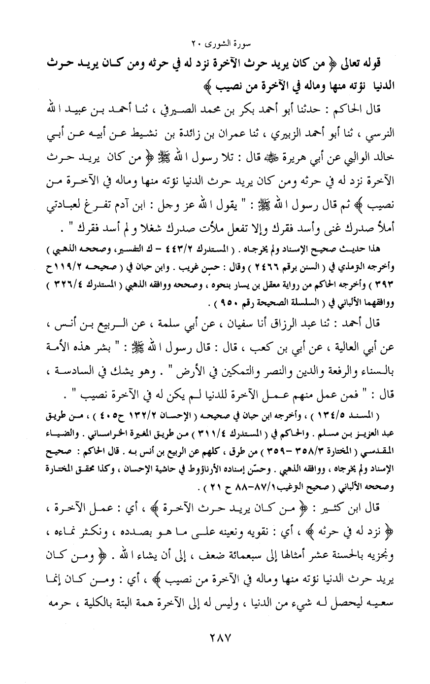 قال الحاكم: حدثنا أبو أحمد بكر بن محمد الصيرفي، ثنا أحمد بن عبيد الله النرسي، ثنا أبو أحمد الزبيري، ثنا عمران بن زائدة بن نشيط عن أبيه عن أبي خالد الوالي عن أبي هريرة - رضي الله عنه - قال: تلا رسول الله - صَلَّى اللَّهُ عَلَيْهِ وَسَلَّمَ - (مَنْ كَانَ يُرِيدُ حَرْثَ الْآَخِرَةِ نَزِدْ لَهُ فِي حَرْثِهِ وَمَنْ كَانَ يُرِيدُ حَرْثَ الدُّنْيَا نُؤْتِهِ مِنْهَا وَمَا لَهُ فِي الْآَخِرَةِ مِنْ نَصِيبٍ) ثم قال رسول الله - صَلَّى اللَّهُ عَلَيْهِ وَسَلَّمَ -: "يقول الله عز وجل: ابن آدم تفرغ لعبادتي أملأ صدرك غنى وأسد فقرك وإلا تفعل ملأت صدرك شغلا ولم أسد فقرك".