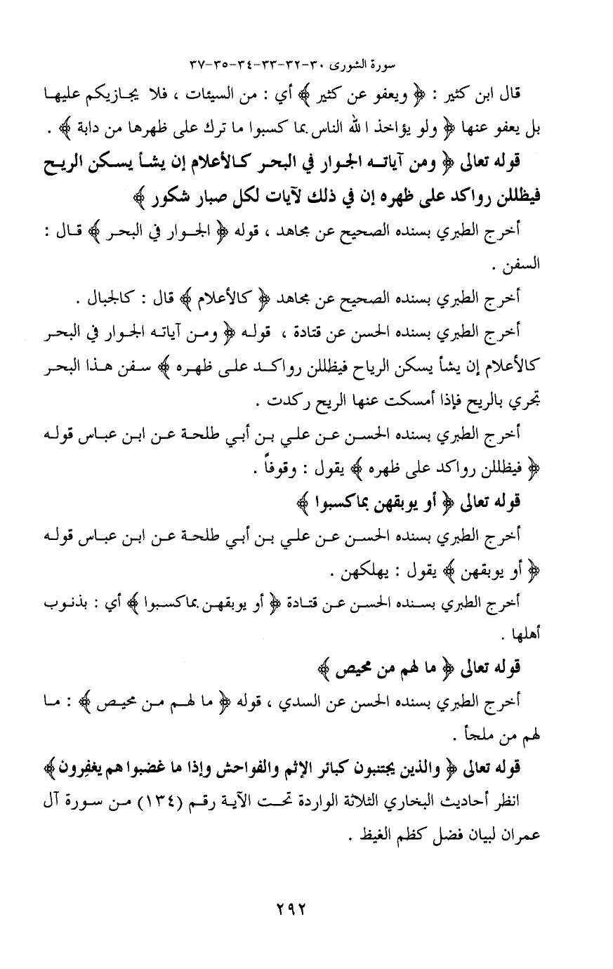 قوله تعالى (وَمِنْ آَيَاتِهِ الْجَوَارِ فِي الْبَحْرِ كَالْأَعْلَامِ (32) إِنْ يَشَأْ يُسْكِنِ الرِّيحَ فَيَظْلَلْنَ رَوَاكِدَ عَلَى ظَهْرِهِ إِنَّ فِي ذَلِكَ لَآَيَاتٍ لِكُلِّ صَبَّارٍ شَكُورٍ)