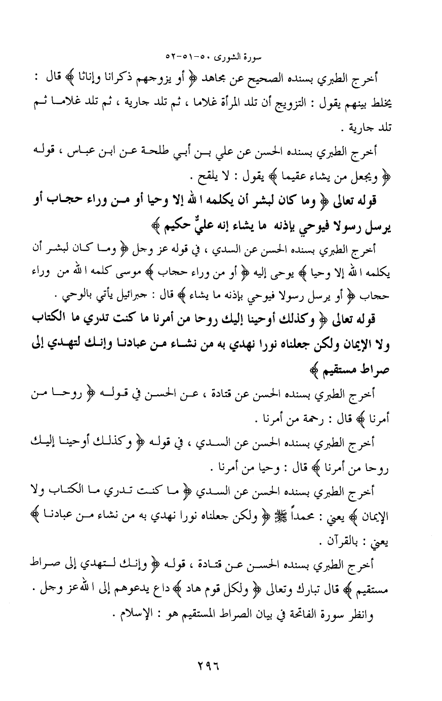 قوله تعالى (وَكَذَلِكَ أَوْحَيْنَا إِلَيْكَ رُوحًا مِنْ أَمْرِنَا مَا كُنْتَ تَدْرِي مَا الْكِتَابُ وَلَا الْإِيمَانُ وَلَكِنْ جَعَلْنَاهُ نُورًا نَهْدِي بِهِ مَنْ نَشَاءُ مِنْ عِبَادِنَا وَإِنَّكَ لَتَهْدِي إِلَى صِرَاطٍ مُسْتَقِيمٍ)