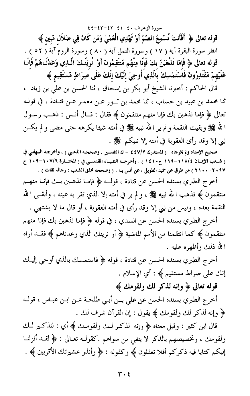 قوله تعالى (فَإِمَّا نَذْهَبَنَّ بِكَ فَإِنَّا مِنْهُمْ مُنْتَقِمُونَ (41) أَوْ نُرِيَنَّكَ الَّذِي وَعَدْنَاهُمْ فَإِنَّا عَلَيْهِمْ مُقْتَدِرُونَ (42) فَاسْتَمْسِكْ بِالَّذِي أُوحِيَ إِلَيْكَ إِنَّكَ عَلَى صِرَاطٍ مُسْتَقِيمٍ)