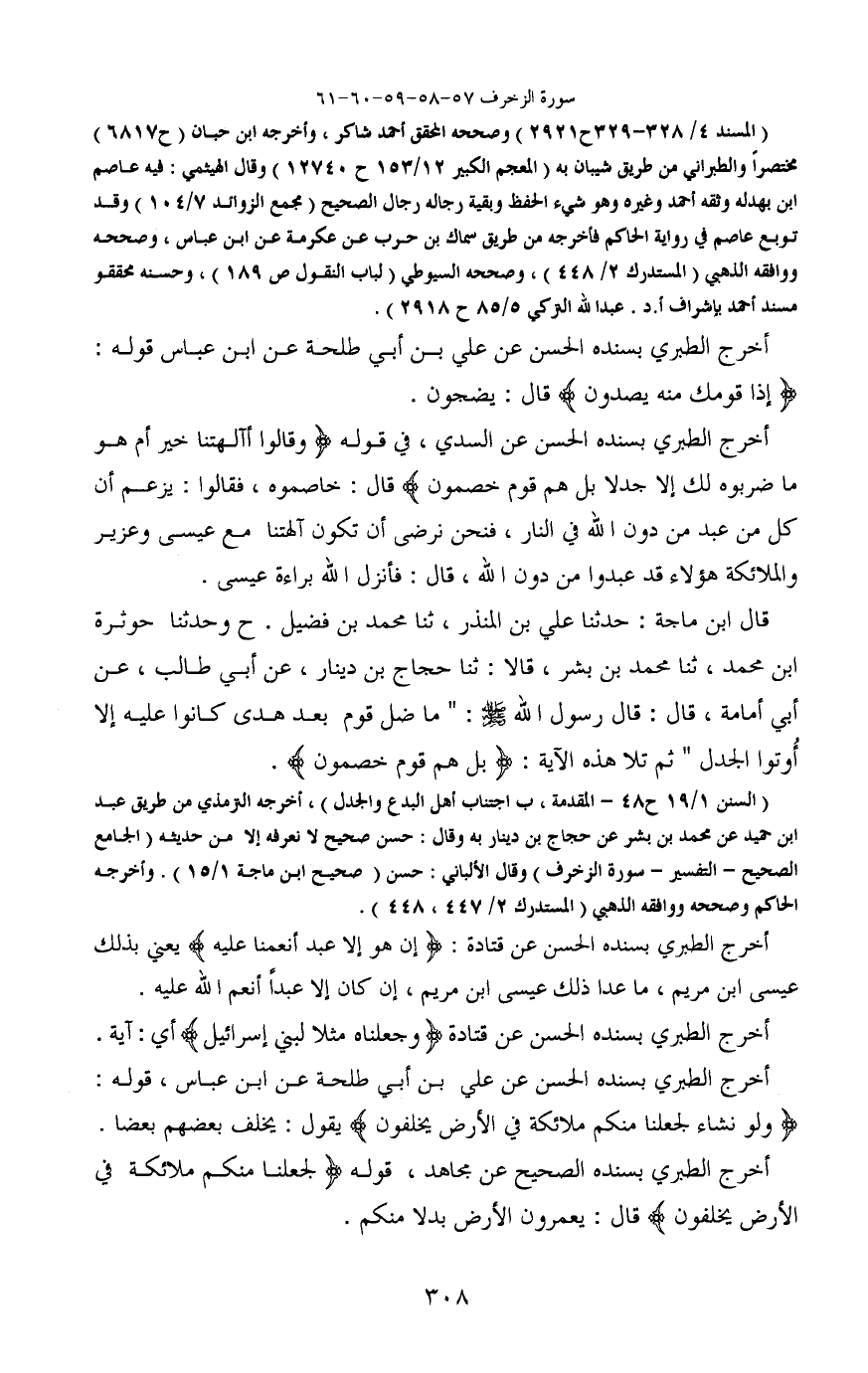 أخرج الطبري بسنده الحسن عن السدي، في قوله (وَقَالُوا أَآَلِهَتُنَا خَيْرٌ أَمْ هُوَ مَا ضَرَبُوهُ لَكَ إِلَّا جَدَلًا بَلْ هُمْ قَوْمٌ خَصِمُونَ) قال: خاصموه، فقالوا: يزعم أن كل من عبد من دون الله في النار، فنحن نرضى أن تكون آلهتنا مع عيسى وعزير والملائكة هؤلاء قد عبدوا من دون الله، قال: فأنزل الله براءة عيسى.