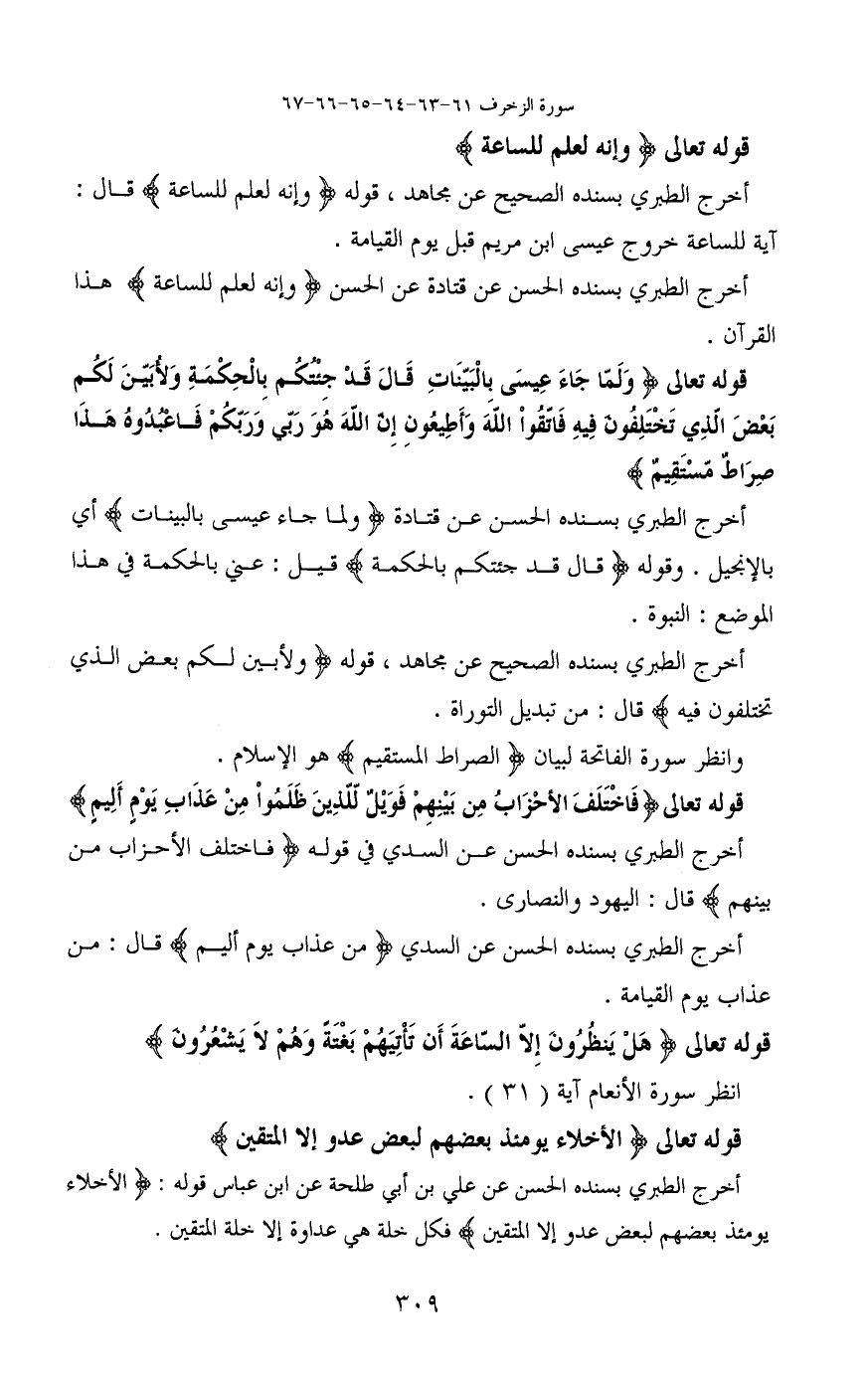 أخرج الطبري بسنده الحسن عن قتادة عن الحسن (وإنه لعلم للساعة) هذا القرآن.