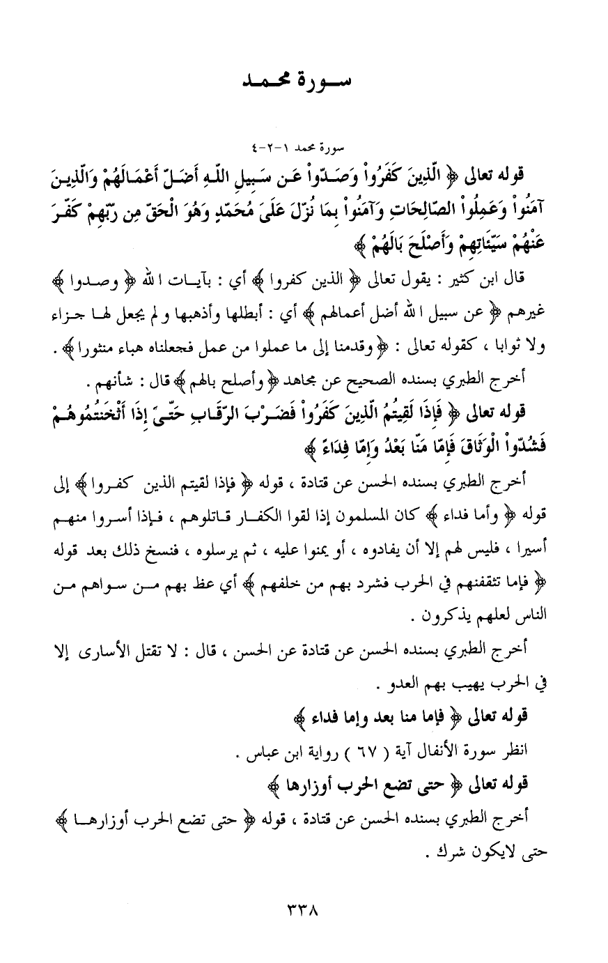 قوله تعالى (فَإِذَا لَقِيتُمُ الَّذِينَ كَفَرُوا فَضَرْبَ الرِّقَابِ حَتَّى إِذَا أَثْخَنْتُمُوهُمْ فَشُدُّوا الْوَثَاقَ فَإِمَّا مَنًّا بَعْدُ وَإِمَّا فِدَاءً)