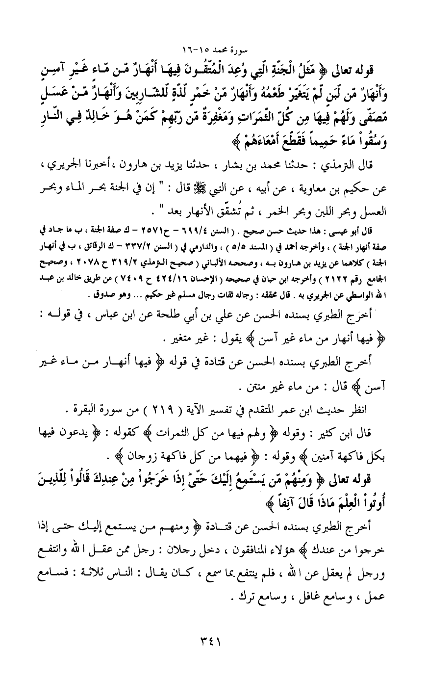 قال أبو عيسى: هذا حديث حسن صحيح. (السنن 4/699 - ح2571 - ك صفة الجنة، ب ما جاء في صفة أنهار الجنة) ، وأخرجه أحمد في (المسند 5/5) ، والدارمي في (السنن 2/337 - ك الرقائق، ب في أنهار الجنة) كلاهما عن يزيد بن هارون به، وصححه الألباني (صحيح الترمذي 2/319 ح2078، وصحيح الجامع رقم2122) وأخرجه ابن حبان في صحيحه (الإحسان 16/424 ح7409) من طريق خالد بن عبد الله الواسطي عن الجريري به. قال محققه: رجاله ثقات رجال مسلم غير حكيم ... وهو صدوق.