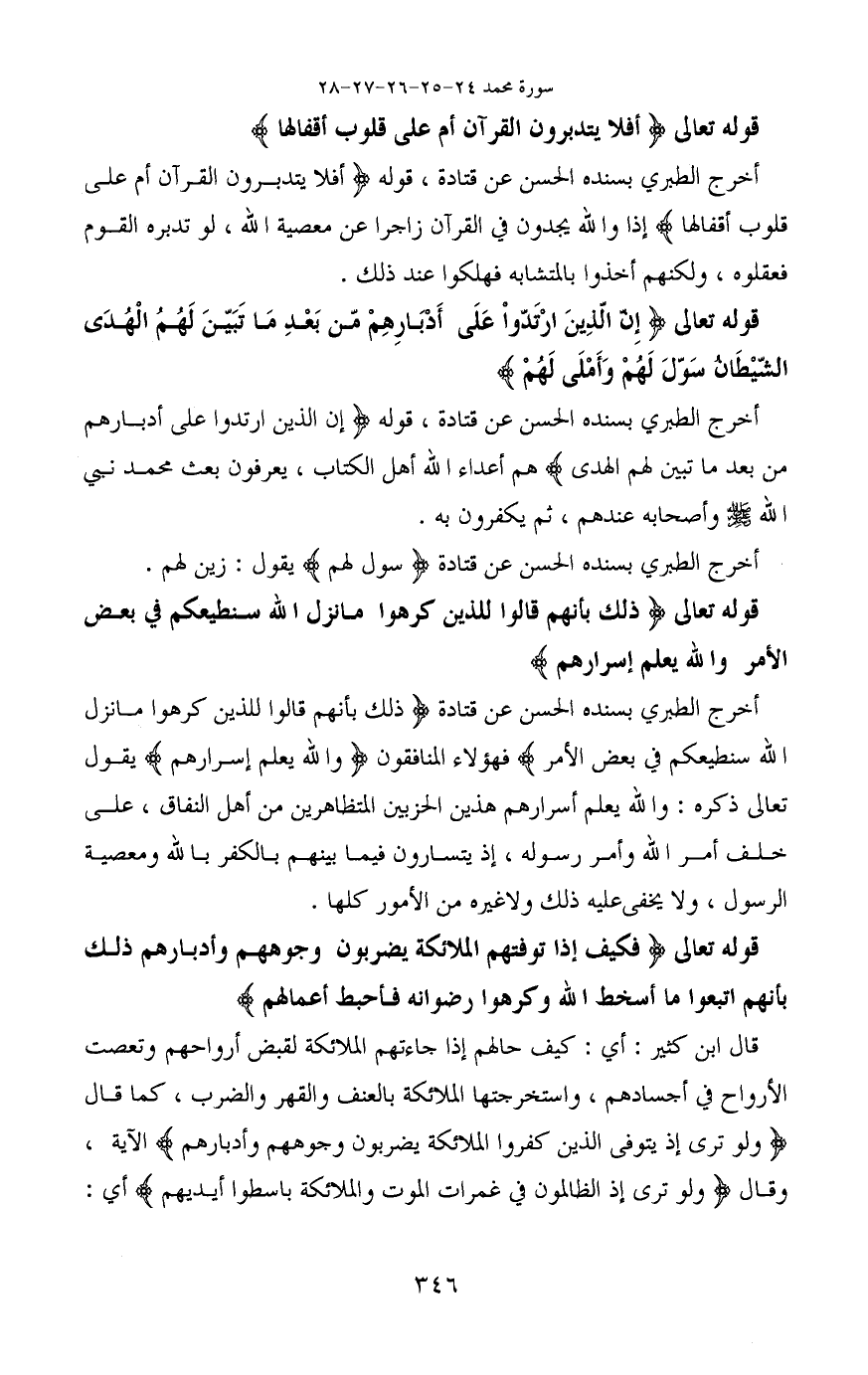 أخرج الطبري بسنده الحسن عن قتادة، قوله (أَفَلَا يَتَدَبَّرُونَ الْقُرْآَنَ أَمْ عَلَى قُلُوبٍ أَقْفَالُهَا) إذا والله يجدون في القرآن زاجرا عن معصية الله، لو تدبره القوم فعقلوه، ولكنهم أخذوا بالمتشابه فهلكوا عند ذلك.