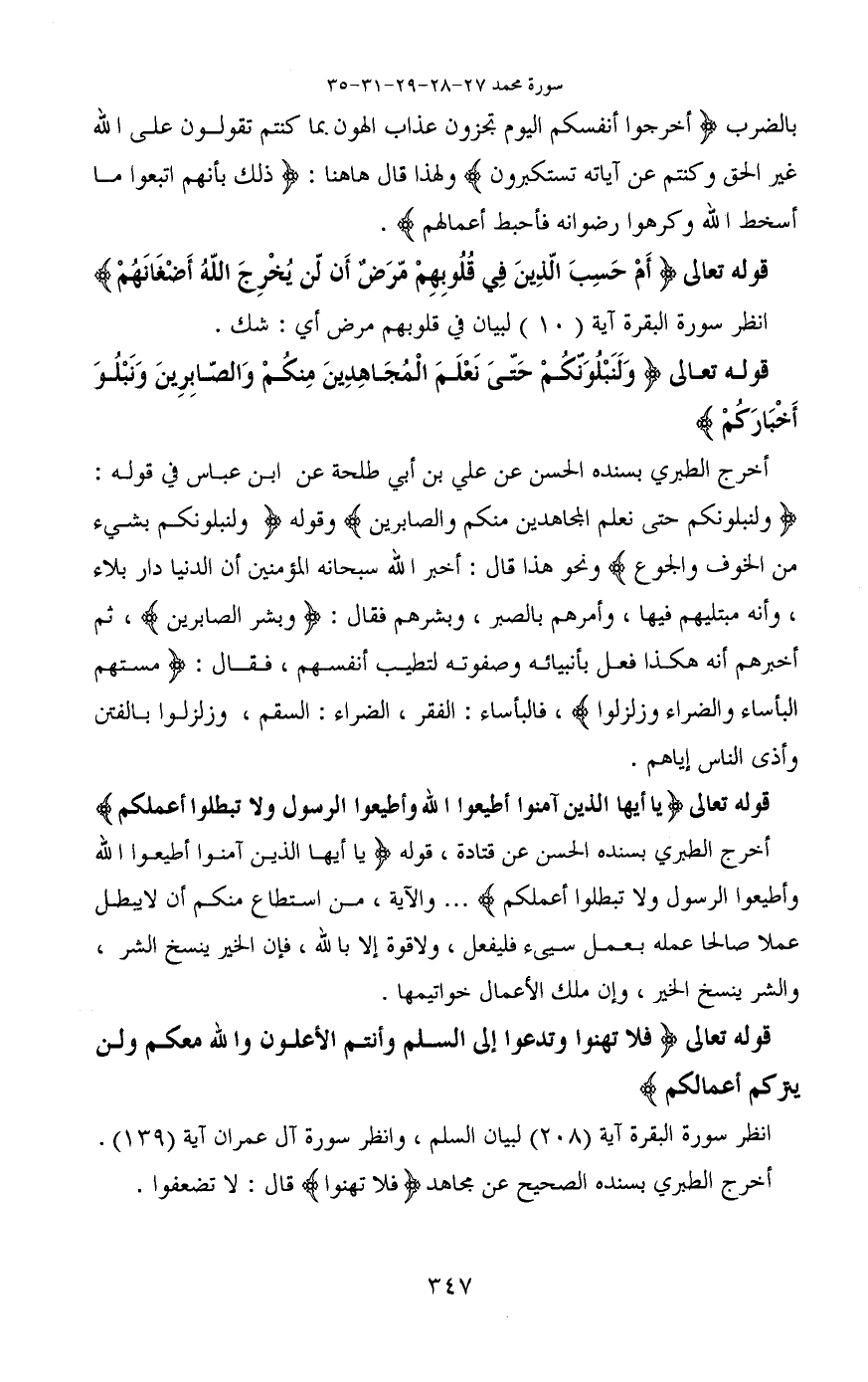 أخرج الطبري بسنده الحسن عن علي بن أبي طلحة عن ابن عباس في قوله: (ولنبلونكم حتى نعلم المجاهدين منكم والصابرين) وقوله (ولنبلونكم بشيء من الخوف والجوع) ونحو هذا قال: أخبر الله سبحانه المؤمنين أن الدنيا دار بلاء، وأنه مبتليهم فيها، وأمرهم بالصبر، وبشرهم فقال: (وبشر الصابرين) ، ثم أخبرهم أنه هكذا فعل بأنبيائه وصفوته لتطيب أنفسهم، فقال: (مستهم البأساء والضراء وزلزلوا) ، فالبأساء: الفقر، الضراء: السقم، وزلزلوا بالفتن وأذى الناس إياهم.