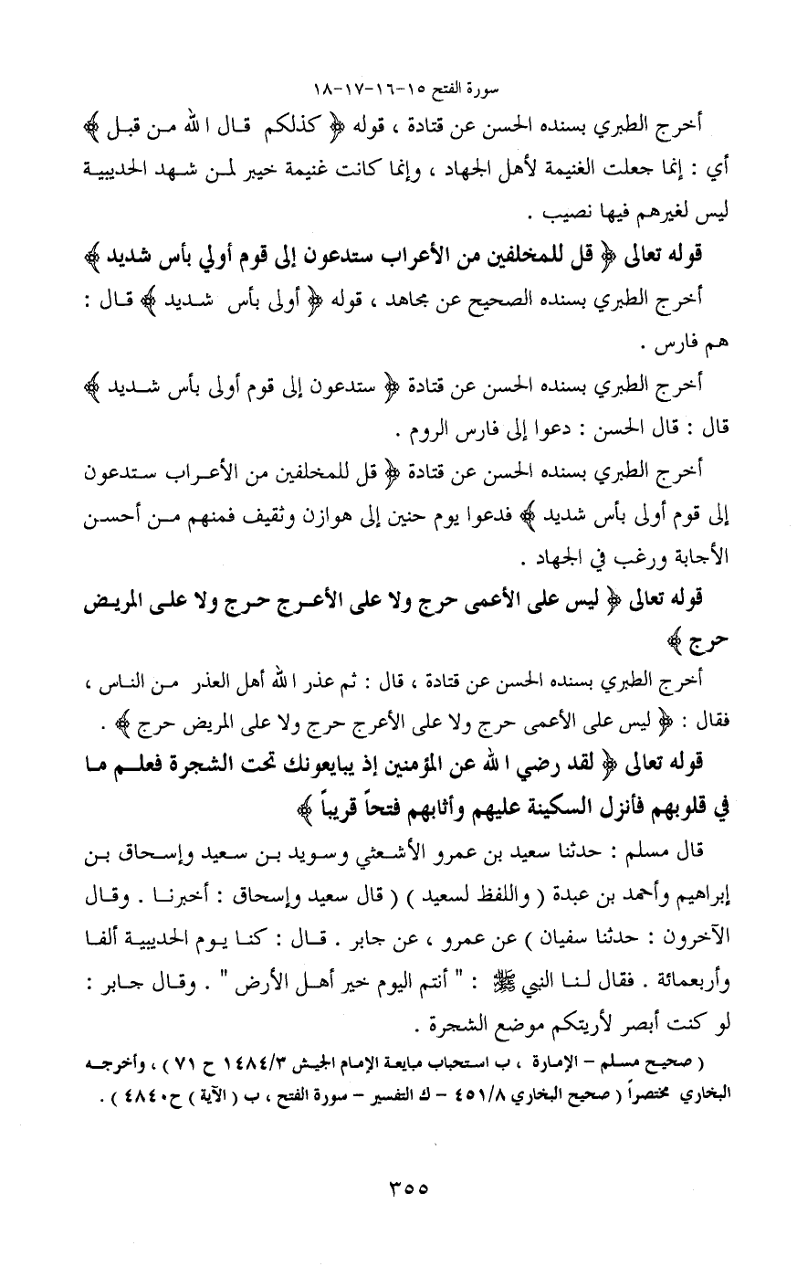 قوله تعالى (لَقَدْ رَضِيَ اللَّهُ عَنِ الْمُؤْمِنِينَ إِذْ يُبَايِعُونَكَ تَحْتَ الشَّجَرَةِ فَعَلِمَ مَا فِي قُلُوبِهِمْ فَأَنْزَلَ السَّكِينَةَ عَلَيْهِمْ وَأَثَابَهُمْ فَتْحًا قَرِيبًا)