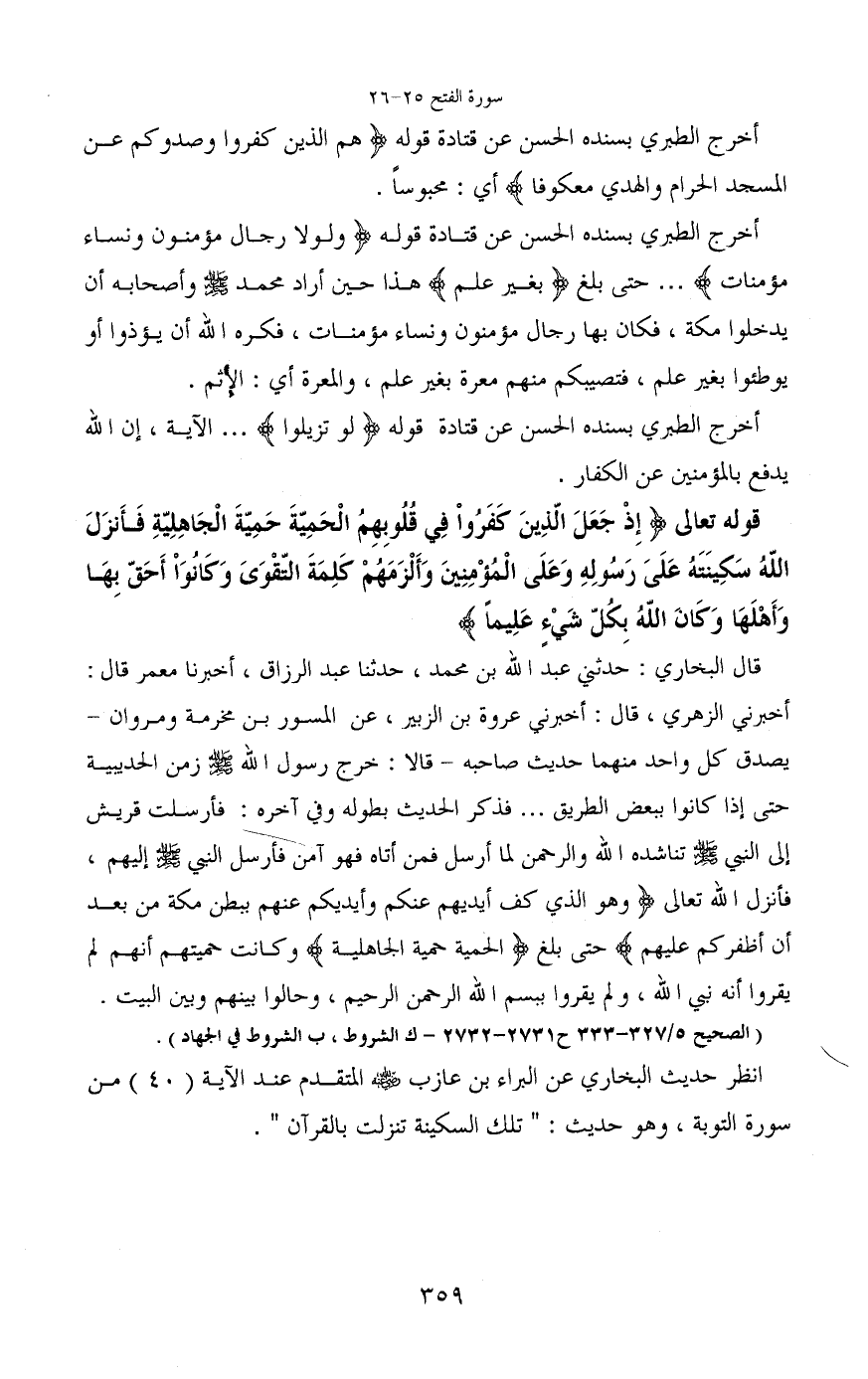 قال البخاري: حدثني عبد الله بن محمد، حدثنا عبد الرزاق، أخبرنا معمر قال: أخبرني الزهري، قال: أخبرني عروة بن الزبير، عن المسور بن مخرمة ومروان -يصدق كل واحد سهما حديث صاحبه- قالا: خرج رسول الله - صَلَّى اللَّهُ عَلَيْهِ وَسَلَّمَ - زمن الحديبية حتى إذا كانوا ببعض الطريق ... فذكر الحديث بطوله وفي آخره: فأرسل قريش إلى النبي - صَلَّى اللَّهُ عَلَيْهِ وَسَلَّمَ - تناشده الله والرحمن لما أرسل فمن أتاه فهو آمن فأرسل النبي - صَلَّى اللَّهُ عَلَيْهِ وَسَلَّمَ - إليهم، فأنزل الله تعالى (وهو الذي كف أيديهم عنكم وأيديكم عنهم ببطن مكة من بعد أن أظفركم عليهم) حتى بلغ (الحمية حمية الجاهلية) وكانت حميتهم أنهم لم يقروا أنه نبي الله، ولم يقروا ببسم الله الرحمن الرحيم، وحالوا بينهم وبين البيت.
