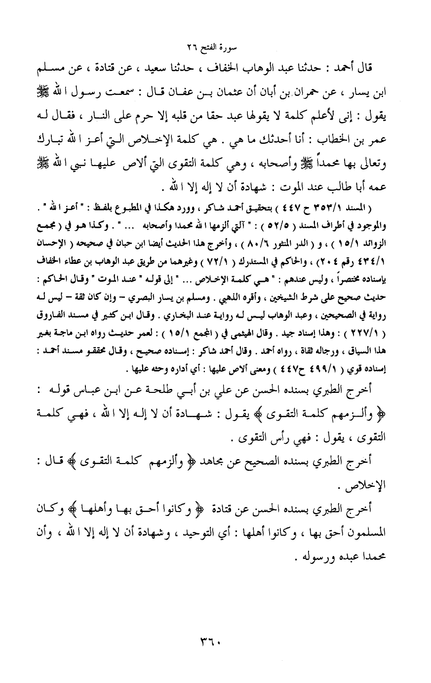 قال أحمد: حدثنا عبد الوهاب الخفاف، حدثنا سعيد، عن قتادة، عن مسلم ابن يسار، عن حمران بن أبان أن عثمان بن عفان قال: سمعت رسول الله - صَلَّى اللَّهُ عَلَيْهِ وَسَلَّمَ - يقول: إني لأعلم كلمة لا يقولها عبد حقا من قلبه إلا حرم على النار، فقال له عمر بن الخطاب: أنا أحدثك ما هي. هي كلمة الإخلاص التي أعز الله تبارك وتعالى بها محمداً - صَلَّى اللَّهُ عَلَيْهِ وَسَلَّمَ - وأصحابه، وهي كلمة التقوى التي ألاص عليها نبي الله - صَلَّى اللَّهُ عَلَيْهِ وَسَلَّمَ - عمه أبا طالب عند الموت: شهادة أن لا إله إلا الله.