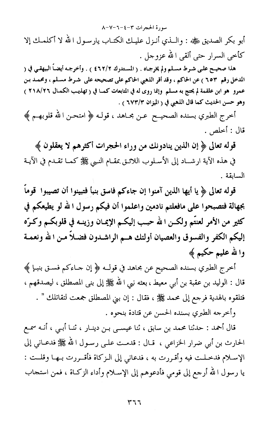 قوله تعالى (يَا أَيُّهَا الَّذِينَ آَمَنُوا إِنْ جَاءَكُمْ فَاسِقٌ بِنَبَإٍ فَتَبَيَّنُوا أَنْ تُصِيبُوا قَوْمًا بِجَهَالَةٍ فَتُصْبِحُوا عَلَى مَا فَعَلْتُمْ نَادِمِينَ (6) وَاعْلَمُوا أَنَّ فِيكُمْ رَسُولَ اللَّهِ لَوْ يُطِيعُكُمْ فِي كَثِيرٍ مِنَ الْأَمْرِ لَعَنِتُّمْ وَلَكِنَّ اللَّهَ حَبَّبَ إِلَيْكُمُ الْإِيمَانَ وَزَيَّنَهُ فِي قُلُوبِكُمْ وَكَرَّهَ إِلَيْكُمُ الْكُفْرَ وَالْفُسُوقَ وَالْعِصْيَانَ أُولَئِكَ هُمُ الرَّاشِدُونَ (7) فَضْلًا مِنَ اللَّهِ وَنِعْمَةً وَاللَّهُ عَلِيمٌ حَكِيمٌ)
