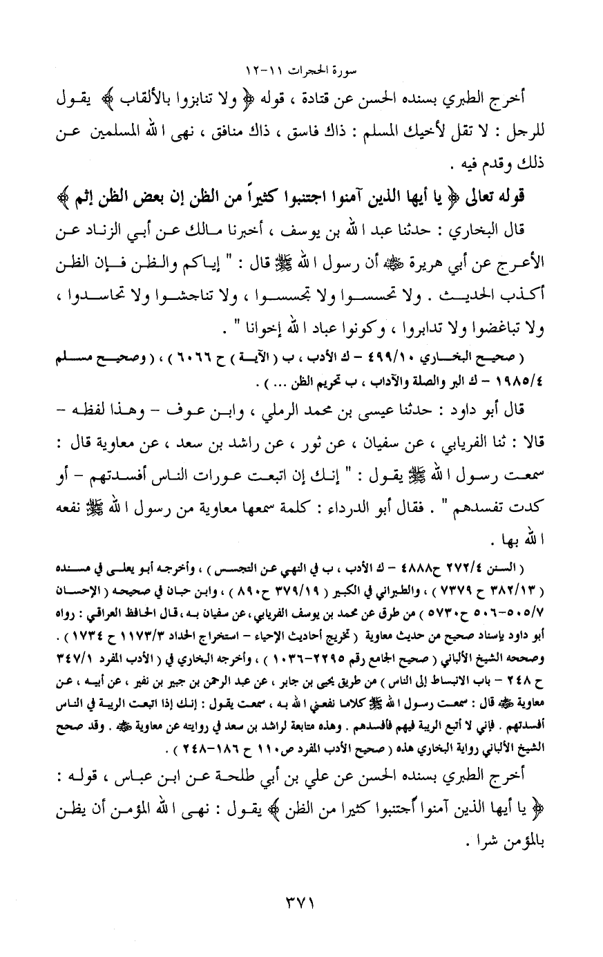 قوله تعالى (يَا أَيُّهَا الَّذِينَ آَمَنُوا اجْتَنِبُوا كَثِيرًا مِنَ الظَّنِّ إِنَّ بَعْضَ الظَّنِّ إِثْمٌ) قال البخاري: حدثنا عبد الله بن يوسف، أخبرنا مالك عن أبي الزناد عن الأعرج عن أبي هريرة - رضي الله عنه - أن رسول الله - صَلَّى اللَّهُ عَلَيْهِ وَسَلَّمَ - قال: "إياكم والظن فإن الظن أكذب الحديث. ولا تحسسوا ولا تجسسوا، ولا تناجشوا ولا تحاسدوا، ولا تباغضوا ولا تدابروا، وكونوا عباد الله إخوانا".