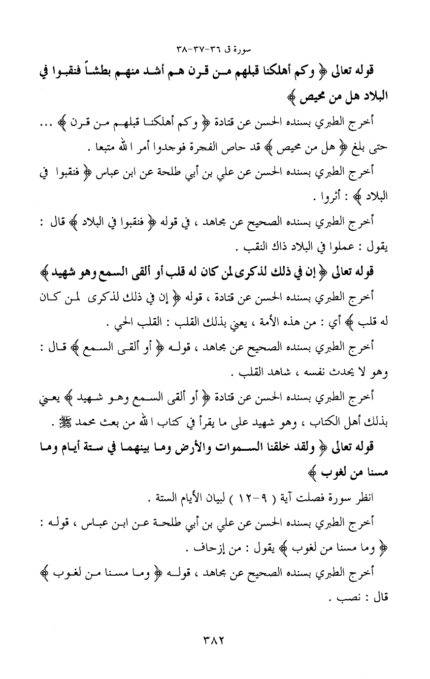 أخرج الطبري بسنده الحسن عن قتادة (وكم أهلكنا قبلهم من قرن) ... حتى بلغ (هل من محيص) قد حاص الفجرة فوجدوا أمر الله متبعا.