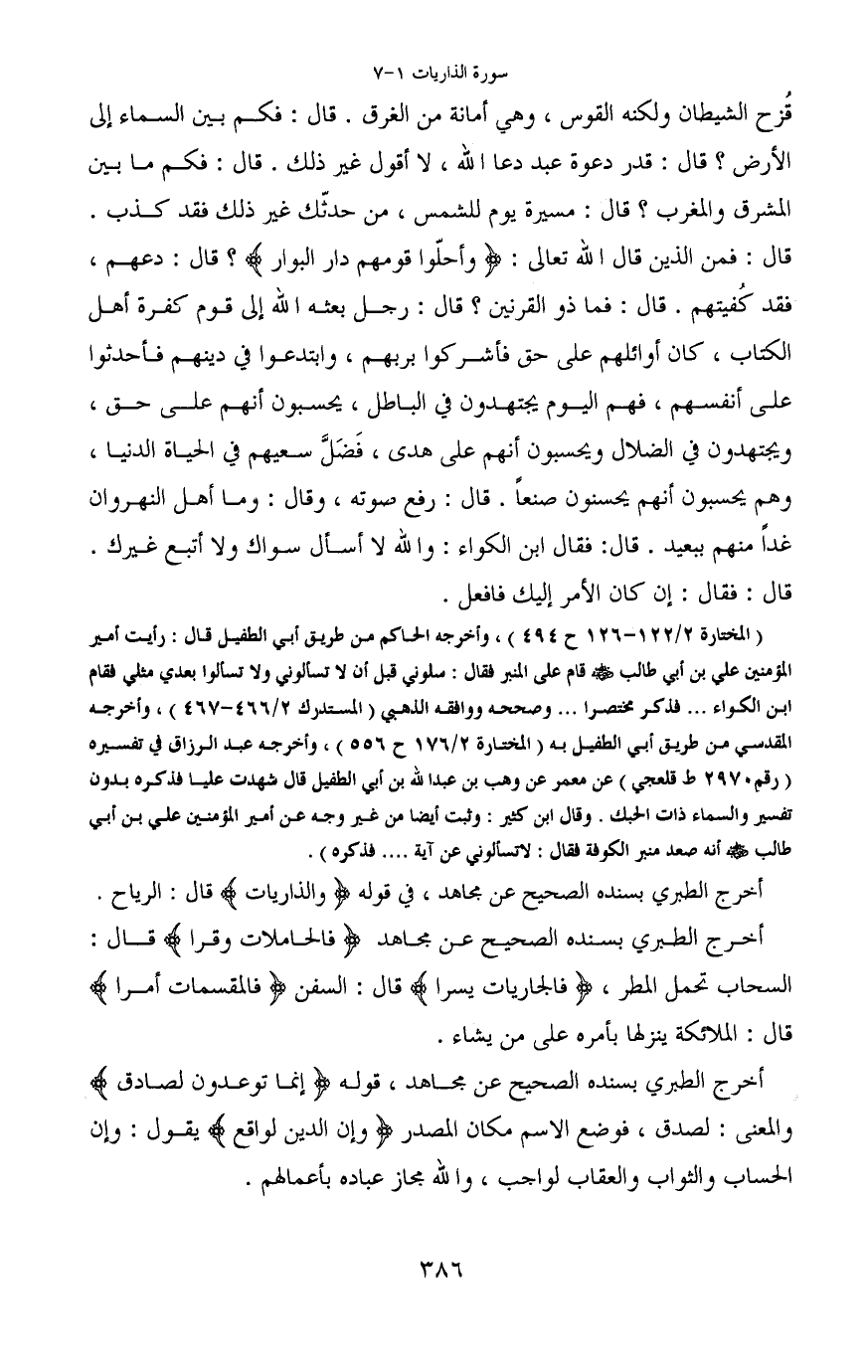 (المختارة 2/122-126 ح494) ، وأخرجه الحاكم من طريق أبي الطفيل قال: رأيت أمير المؤمنين علي بن أبي طالب - رضي الله عنه - قام على المنبر فقال: سلوني قبل أن لا تسألوني ولا تسألوا بعدي مثلي فقام ابن الكواء ... فذكر مختصرا ... وصححه ووافقه الذهبي (المستدرك 2/466-467) ، وأخرجه المقدسي من طريق أبي الطفيل به (المختارة 2/176 ح556) ، وأخرجه عبد الرزاق في تفسيره (رقم 2970 ط قلعجي) عن معمر عن وهب بن عبد الله بن أبي الطفيل قال شهدت عليا فذكره بدون تفسير والسماء ذات الحبك. وقال ابن كثير: وثبت أيضا من غير وجه عن أمير المؤمنين علي بن أبي طالب - رضي الله عنه - أنه صعد منبر الكوفة فقال: لا تسألوني عن آية ... فذكره) .