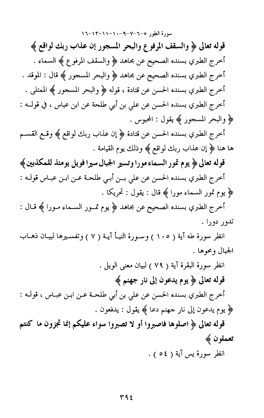 قوله تعالى (وَالسَّقْفِ الْمَرْفُوعِ (5) وَالْبَحْرِ الْمَسْجُورِ (6) إِنَّ عَذَابَ رَبِّكَ لَوَاقِعٌ) أخرج الطبري بسنده الصحيح عن مجاهد (والسقف المرفوع) والسماء.