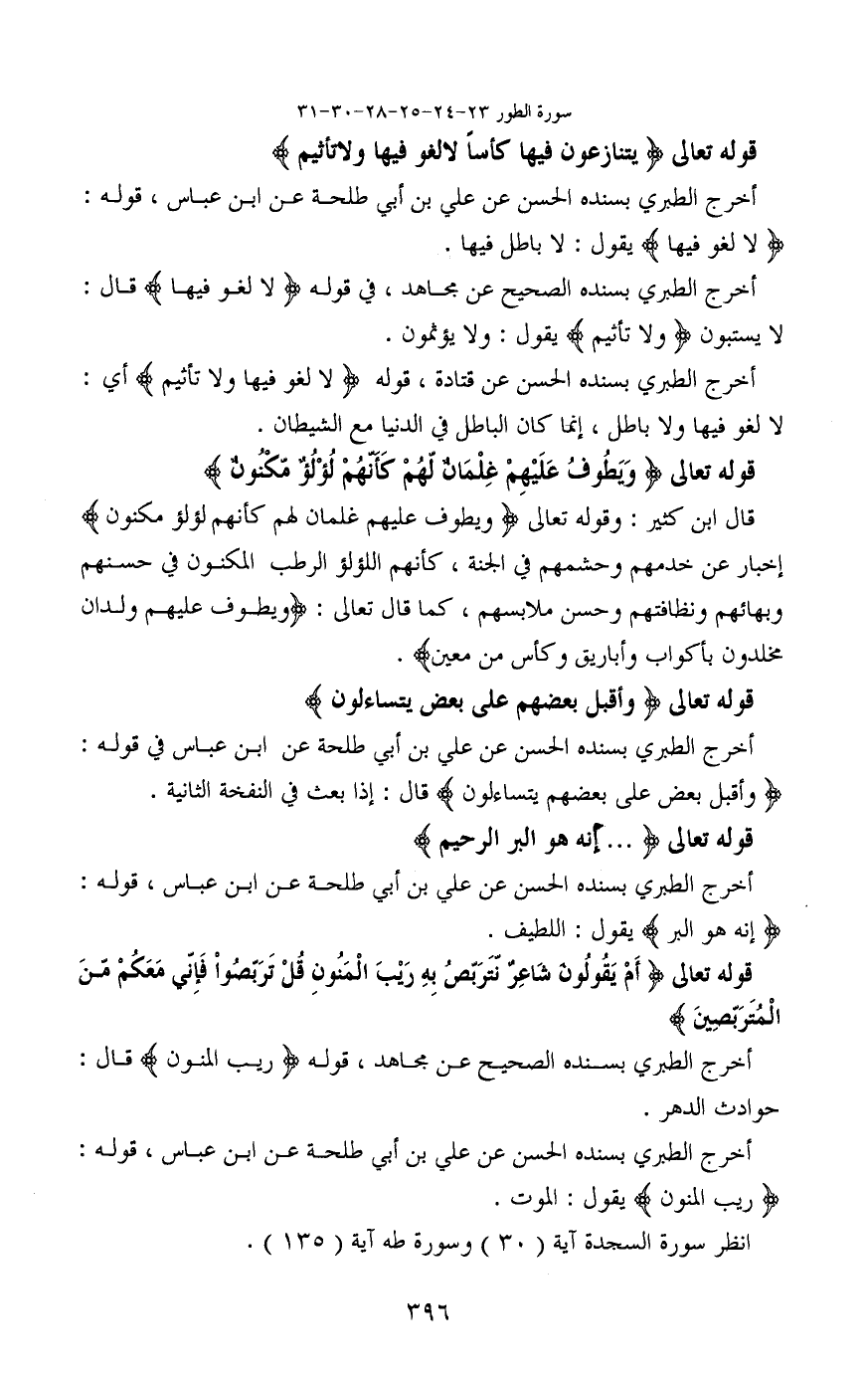 أخرج الطبري بسنده الحسن عن علي بن أبي طلحة عن ابن عباس، قوله: (لا لغو فيها) يقول: لا باطل فيها.