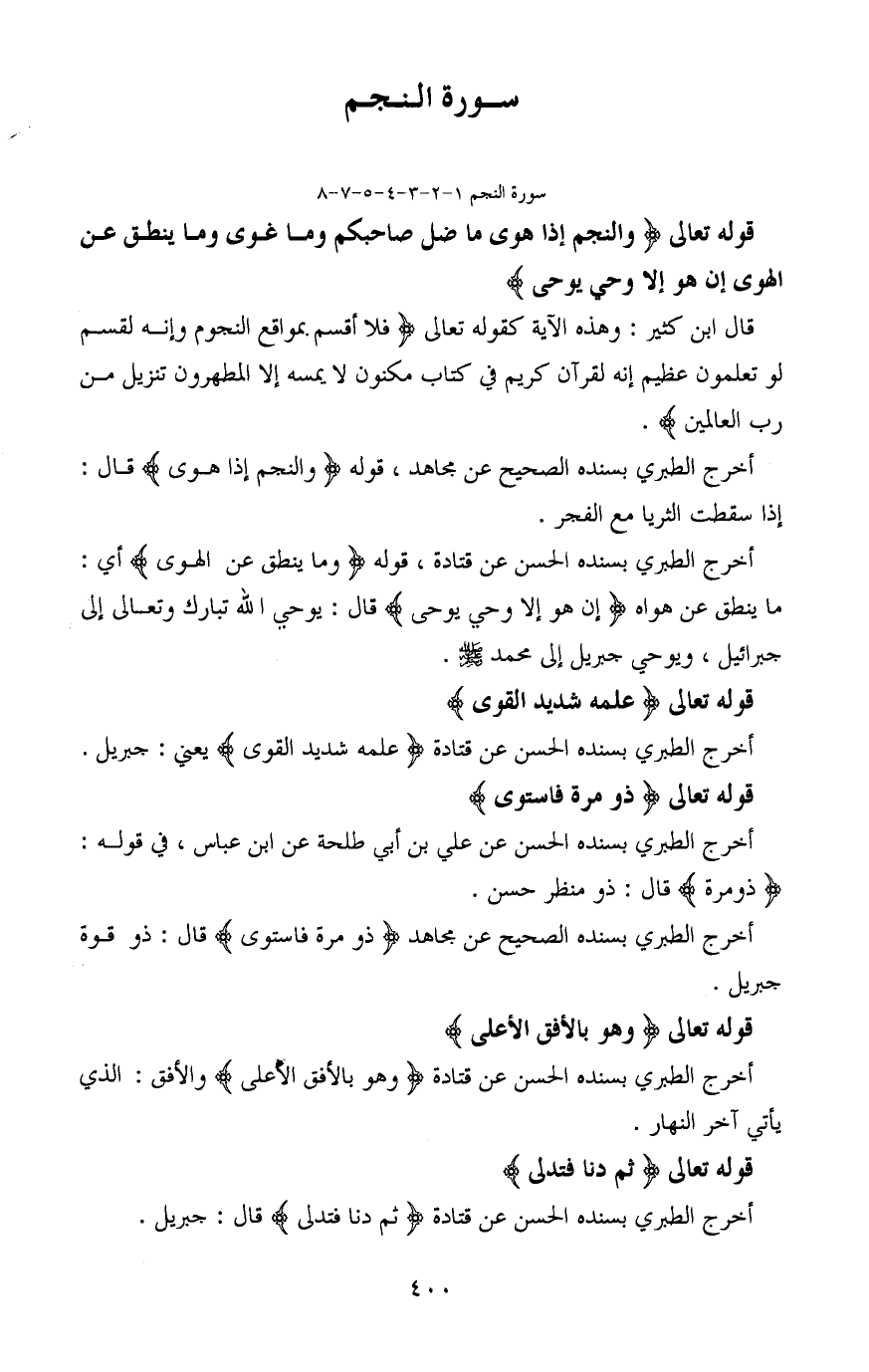 أخرج الطبري بسنده الحسن عن قتادة، قوله (وما ينطق عن الهوى) أي: ما ينطق عن هواه (إن هو إلا وحي يوحى) قال: يوحي الله تبارك وتعالى إلى جبرائيل، ويوحي جبريل إلى محمد - صَلَّى اللَّهُ عَلَيْهِ وَسَلَّمَ -.