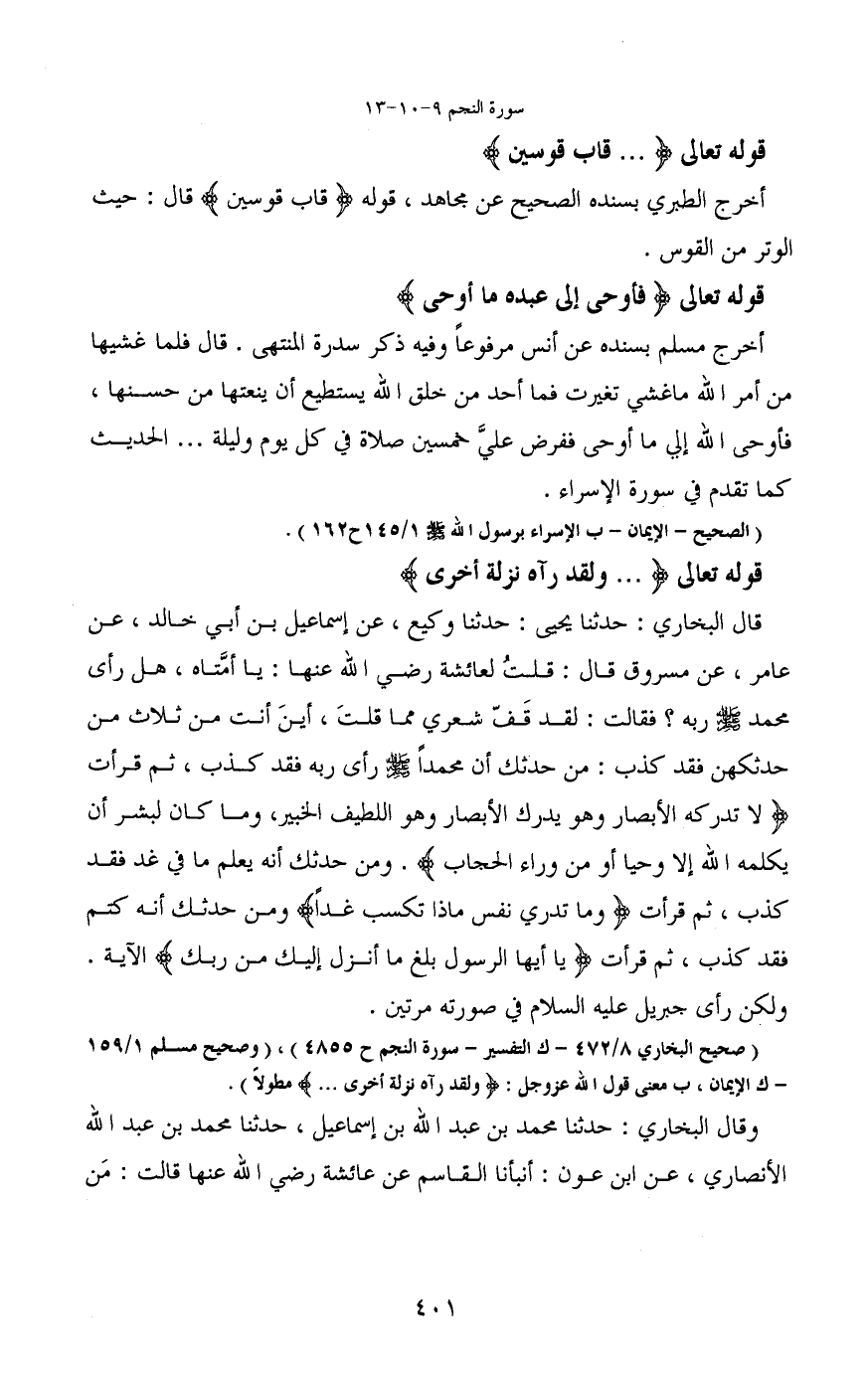 قال البخاري: حدثنا يحيى: حدثنا وكيع، عن إسماعيل بن أبي خالد، عن عامر، عن مسروق قال: قلتُ لعائشة رضي الله عنها: يا أمَّتاه، هل رأى محمد - صَلَّى اللَّهُ عَلَيْهِ وَسَلَّمَ - ربه؟ فقالت: لقد قفّ شعري مما قلتَ، أينَ أنت من ثلاث من حدثكهن فقد كذب: من حدثك أن محمداً - صَلَّى اللَّهُ عَلَيْهِ وَسَلَّمَ - رأى ربه فقد كذب، ثم قرأت (لَا تُدْرِكُهُ الْأَبْصَارُ وَهُوَ يُدْرِكُ الْأَبْصَارَ وَهُوَ اللَّطِيفُ الْخَبِيرُ) ، (وَمَا كَانَ لِبَشَرٍ أَنْ يُكَلِّمَهُ اللَّهُ إِلَّا وَحْيًا أَوْ مِنْ وَرَاءِ حِجَابٍ) . ومن حدثك أنه يعلم ما في غد فقد كذب، ثم قرأت (وما تدري نفس ماذا تكسب غداً) ومن حدثك أنه كتم فقد كذب، ثم قرأت (يا أيها الرسول بلغ ما أنزل إليك من ربك) الآية.