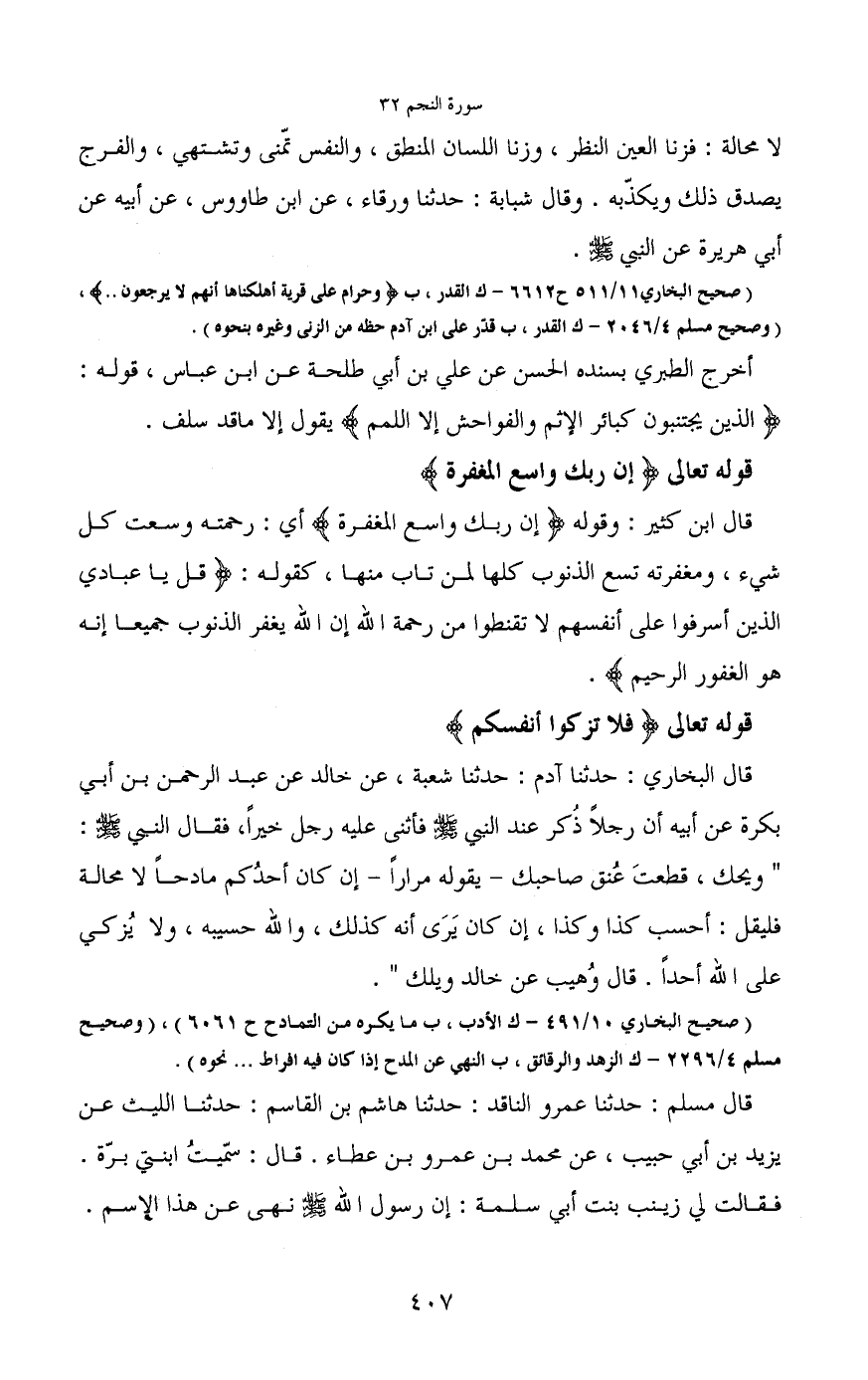 أخرج الطبري بسنده الحسن عن علي بن أبي طلحة عن ابن عباس، قوله: (الذين يجتنبون كبائر الإثم والفواحش إلا اللمم) يقول إلا ما قد سلف.