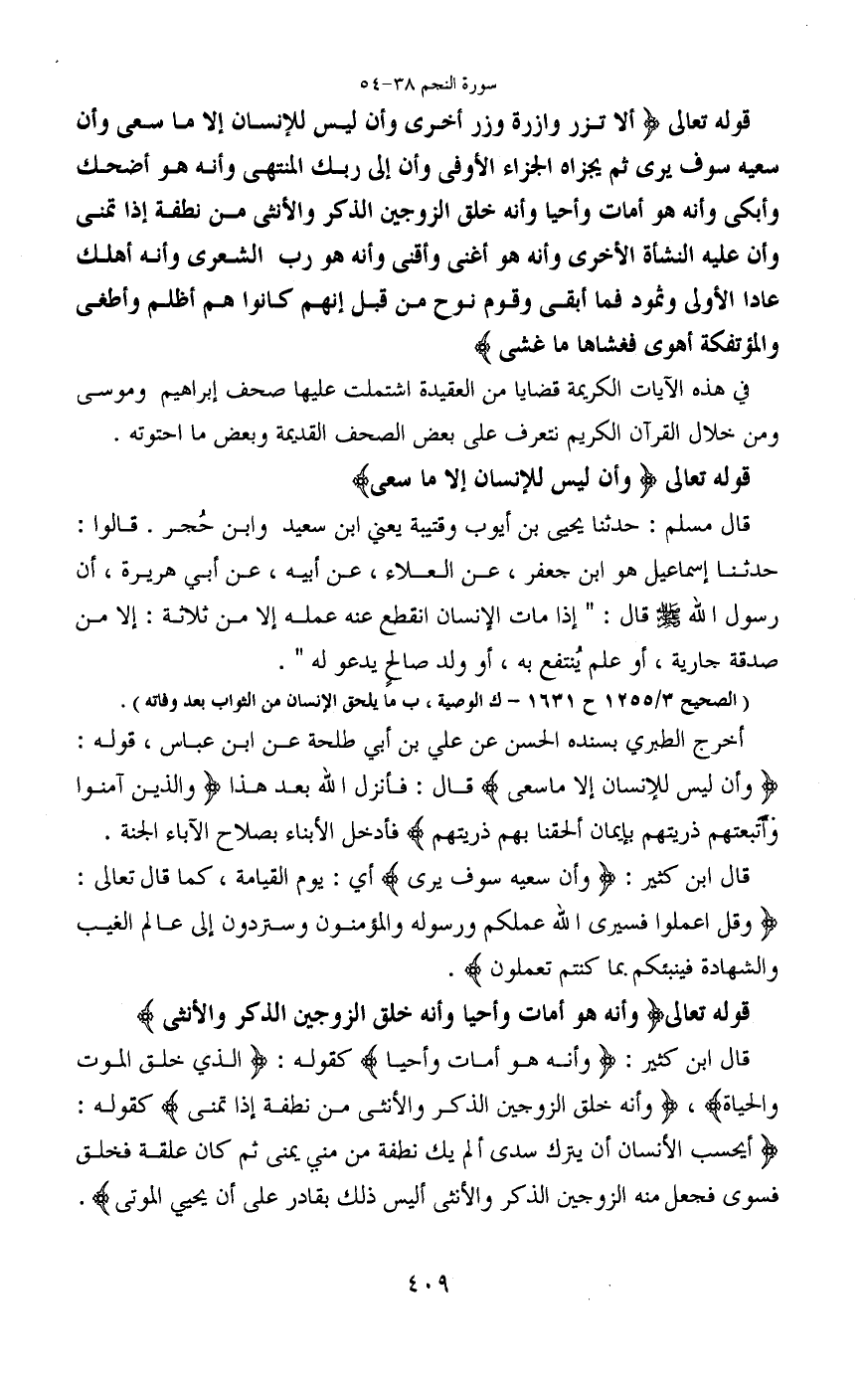 قوله تعالى (أَلَّا تَزِرُ وَازِرَةٌ وِزْرَ أُخْرَى (38) وَأَنْ لَيْسَ لِلْإِنْسَانِ إِلَّا مَا سَعَى (39) وَأَنَّ سَعْيَهُ سَوْفَ يُرَى (40) ثُمَّ يُجْزَاهُ الْجَزَاءَ الْأَوْفَى (41) وَأَنَّ إِلَى رَبِّكَ الْمُنْتَهَى (42) وَأَنَّهُ هُوَ أَضْحَكَ وَأَبْكَى (43) وَأَنَّهُ هُوَ أَمَاتَ وَأَحْيَا (44) وَأَنَّهُ خَلَقَ الزَّوْجَيْنِ الذَّكَرَ وَالْأُنْثَى (45) مِنْ نُطْفَةٍ إِذَا تُمْنَى (46) وَأَنَّ عَلَيْهِ النَّشْأَةَ الْأُخْرَى (47) وَأَنَّهُ هُوَ أَغْنَى وَأَقْنَى (48) وَأَنَّهُ هُوَ رَبُّ الشِّعْرَى (49) وَأَنَّهُ أَهْلَكَ عَادًا الْأُولَى (50) وَثَمُودَ فَمَا أَبْقَى (51) وَقَوْمَ نُوحٍ مِنْ قَبْلُ إِنَّهُمْ كَانُوا هُمْ أَظْلَمَ وَأَطْغَى (52) وَالْمُؤْتَفِكَةَ أَهْوَى (53) فَغَشَّاهَا مَا غَشَّى)