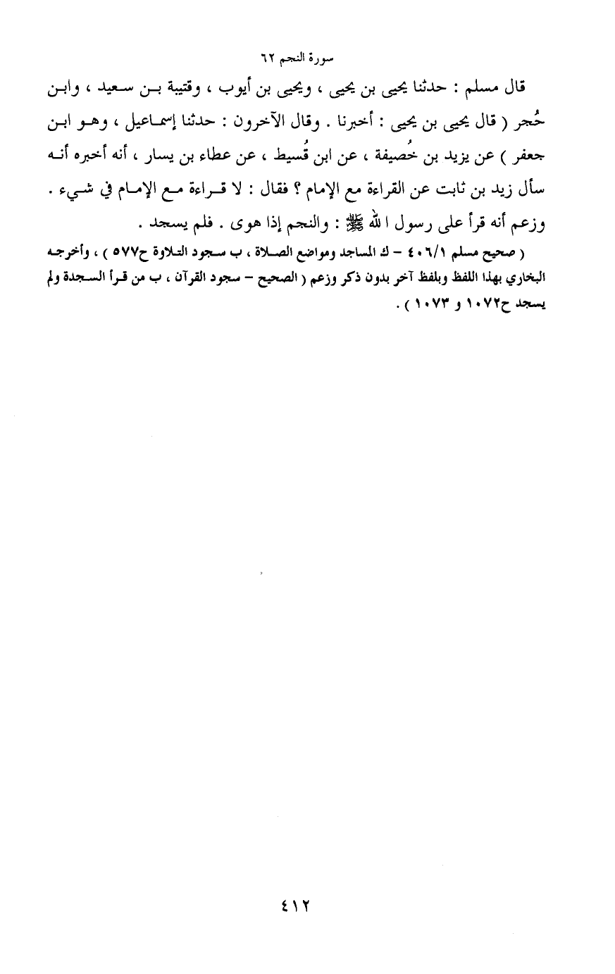 قال مسلم: حدثنا يحيى بن يحيى، ويحيى بن أيوب، وقتيبة بن سعيد، وابن حُجر (قال يحيى بن يحيى: أخبرنا. وقال الآخرون: حدثنا إسماعيل، وهو ابن جعفر) عن يزيد بن خُصيفة، عن ابن قُسيط، عن عطاء بن يسار، أنه أخبره أنه سأل زيد بن ثابت عن القراءة مع الإمام؟ فقال: لا قراءة مع الإمام في شيء.