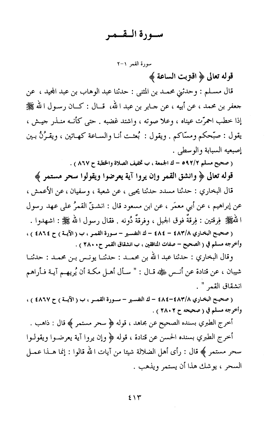 قوله تعالى (وَانْشَقَّ الْقَمَرُ (1) وَإِنْ يَرَوْا آَيَةً يُعْرِضُوا وَيَقُولُوا سِحْرٌ مُسْتَمِرٌّ) قال البخاري: حدثنا مسدد حدثنا يحيى، عن شعبة، وسفيان، عن الأعمش، عن إبراهيم، عن أبي معمَر، عن ابن مسعود قال: انشق القمرُ على عهد رسول الله - صَلَّى اللَّهُ عَلَيْهِ وَسَلَّمَ - فِرقتين: فِرقة فوق الجبل، وفرقةٌ دُونه. فقال رسول الله - صَلَّى اللَّهُ عَلَيْهِ وَسَلَّمَ -: اشهدوا.