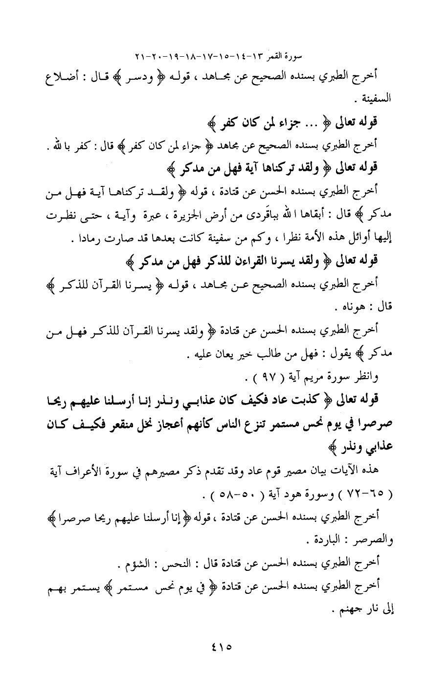 قوله تعالى (كَذَّبَتْ عَادٌ فَكَيْفَ كَانَ عَذَابِي وَنُذُرِ (18) إِنَّا أَرْسَلْنَا عَلَيْهِمْ رِيحًا صَرْصَرًا فِي يَوْمِ نَحْسٍ مُسْتَمِرٍّ (19) تَنْزِعُ النَّاسَ كَأَنَّهُمْ أَعْجَازُ نَخْلٍ مُنْقَعِرٍ (20) فَكَيْفَ كَانَ عَذَابِي وَنُذُر)