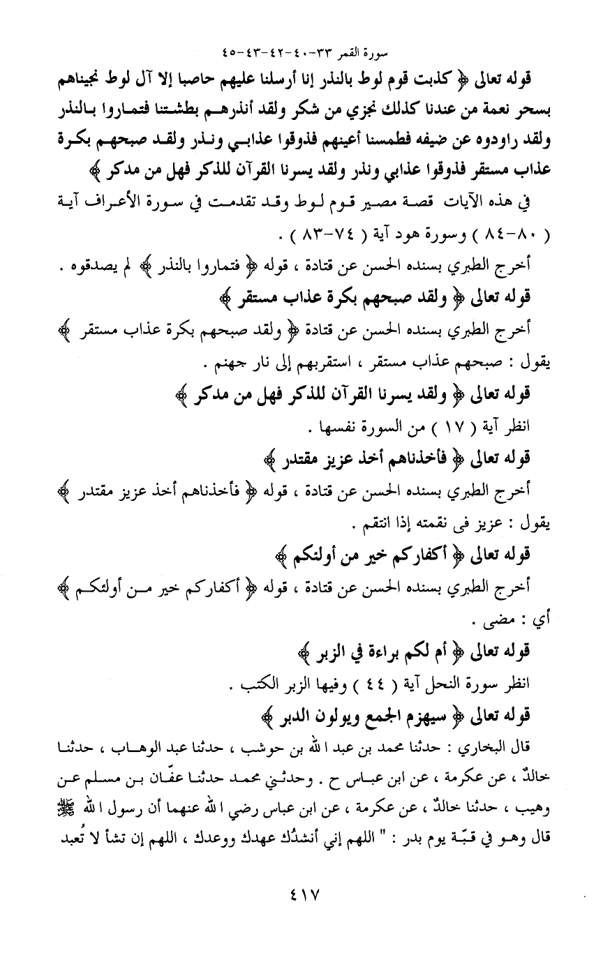 قوله تعالى (كَذَّبَتْ قَوْمُ لُوطٍ بِالنُّذُرِ (33) إِنَّا أَرْسَلْنَا عَلَيْهِمْ حَاصِبًا إِلَّا آَلَ لُوطٍ نَجَّيْنَاهُمْ بِسَحَرٍ (34) نِعْمَةً مِنْ عِنْدِنَا كَذَلِكَ نَجْزِي مَنْ شَكَرَ (35) وَلَقَدْ أَنْذَرَهُمْ بَطْشَتَنَا فَتَمَارَوْا بِالنُّذُرِ (36) وَلَقَدْ رَاوَدُوهُ عَنْ ضَيْفِهِ فَطَمَسْنَا أَعْيُنَهُمْ فَذُوقُوا عَذَابِي وَنُذُرِ (37) وَلَقَدْ صَبَّحَهُمْ بُكْرَةً عَذَابٌ مُسْتَقِرٌّ (38) فَذُوقُوا عَذَابِي وَنُذُرِ (39) وَلَقَدْ يَسَّرْنَا الْقُرْآَنَ لِلذِّكْرِ فَهَلْ مِنْ مُدَّكِرٍ)