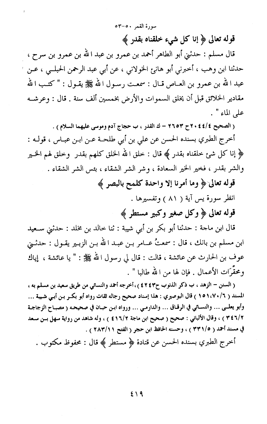أخرج الطبري بسنده الحسن عن علي بن أبي طلحة عن ابن عباس، قوله: (إِنَّا كُلَّ شَيْءٍ خَلَقْنَاهُ بِقَدَرٍ) قال: خلق الله الخلق كلهم بقدر وخلق لهم الخير والشر بقدر، فخير الخير السعادة، وشر الشر الشقاء، بئس الشر الشقاء.