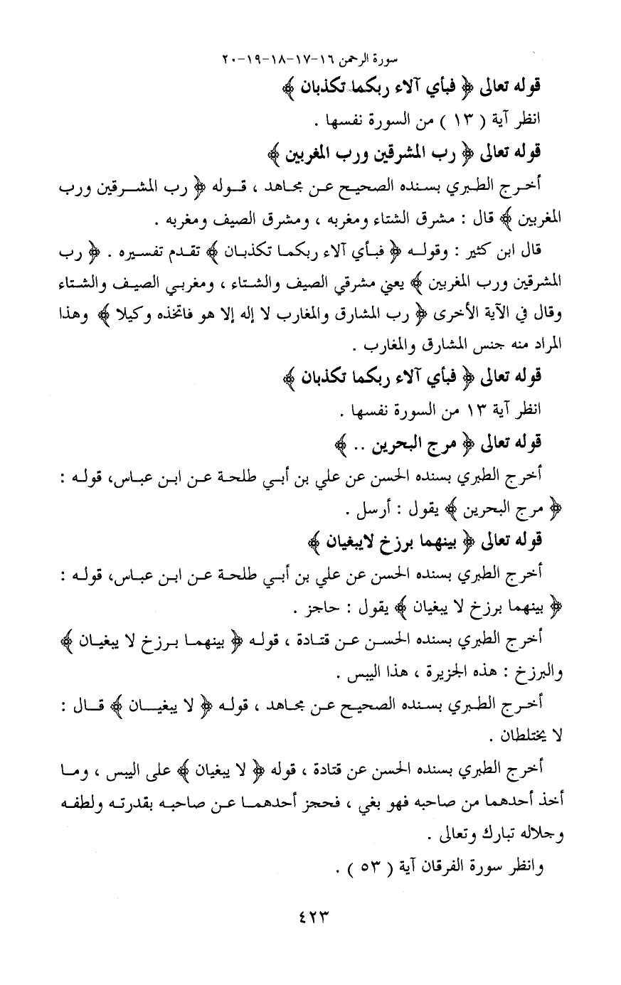 قال ابن كثير: وقوله (فَبِأَيِّ آَلَاءِ رَبِّكُمَا تُكَذِّبَانِ) تقدم تفسيره. (رَبُّ الْمَشْرِقَيْنِ وَرَبُّ الْمَغْرِبَيْنِ) يعني مشرقي الصيف والشتاء، ومغربي الصيف والشتاء وقال في الآية الأخرى (رَبُّ الْمَشْرِقِ وَالْمَغْرِبِ لَا إِلَهَ إِلَّا هُوَ فَاتَّخِذْهُ وَكِيلًا) وهذا المراد منه جنس المشارق والمغارب.