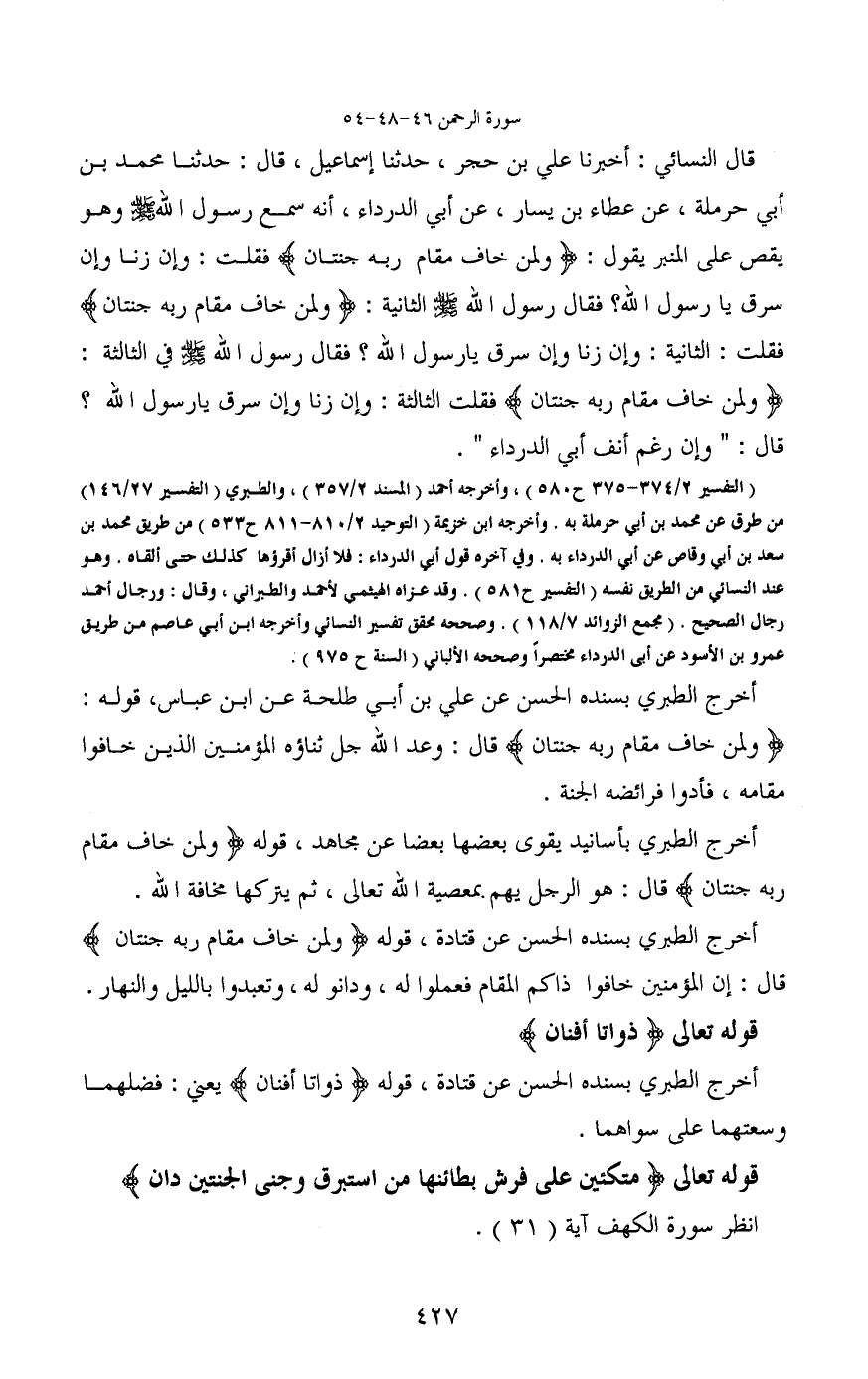 قال النسائي: أخبرنا علي بن حجر، حدثنا إسماعيل، قال: حدثنا محمد بن أبي حرملة، عن عطاء بن يسار، عن أبي الدرداء، أنه سمع رسول الله - صَلَّى اللَّهُ عَلَيْهِ وَسَلَّمَ - وهو يقص على المنبر يقول: (ولمن خاف مقام ربه جنتان) فقلت: وإن زنا وإن سرق يا رسول الله؟ فقال رسول الله - صَلَّى اللَّهُ عَلَيْهِ وَسَلَّمَ - الثانية: (ولمن خاف مقام ربه جنتان) فقلت: الثانية: وإن زنا وإن سرق يا رسول الله؟ فقال رسول الله - صَلَّى اللَّهُ عَلَيْهِ وَسَلَّمَ - في الثالثة: (ولمن خاف مقام ربه جنتان) فقلت الثالثة: وإن زنا وإن سرق يا رسول الله؟ قال: "وإن رغم أنف أبي الدرداء".