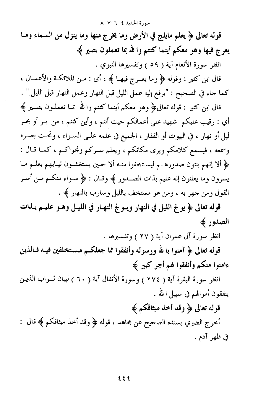 قال ابن كثير: قوله تعالى (وهو معكم أينما كنتم والله بما تعملون بصير) أي: رقيب عليكم شهيد على أعمالكم حيث أنتم، وأين كنتم، من بر أو بحر ليل أو نهار، في البيوت أو القفار، الجميع في علمه على السواء، وتحت بصره وسعه، فيسع كلامكم ويرى مكانكم، ويعلم سركم ونجواكم، كما قال: (أَلَا إِنَّهُمْ يَثْنُونَ صُدُورَهُمْ لِيَسْتَخْفُوا مِنْهُ أَلَا حِينَ يَسْتَغْشُونَ ثِيَابَهُمْ يَعْلَمُ مَا يُسِرُّونَ وَمَا يُعْلِنُونَ إِنَّهُ عَلِيمٌ بِذَاتِ الصُّدُورِ) وقال: (سَوَاءٌ مِنْكُمْ مَنْ أَسَرَّ الْقَوْلَ وَمَنْ جَهَرَ بِهِ وَمَنْ هُوَ مُسْتَخْفٍ بِاللَّيْلِ وَسَارِبٌ بِالنَّهَارِ) .