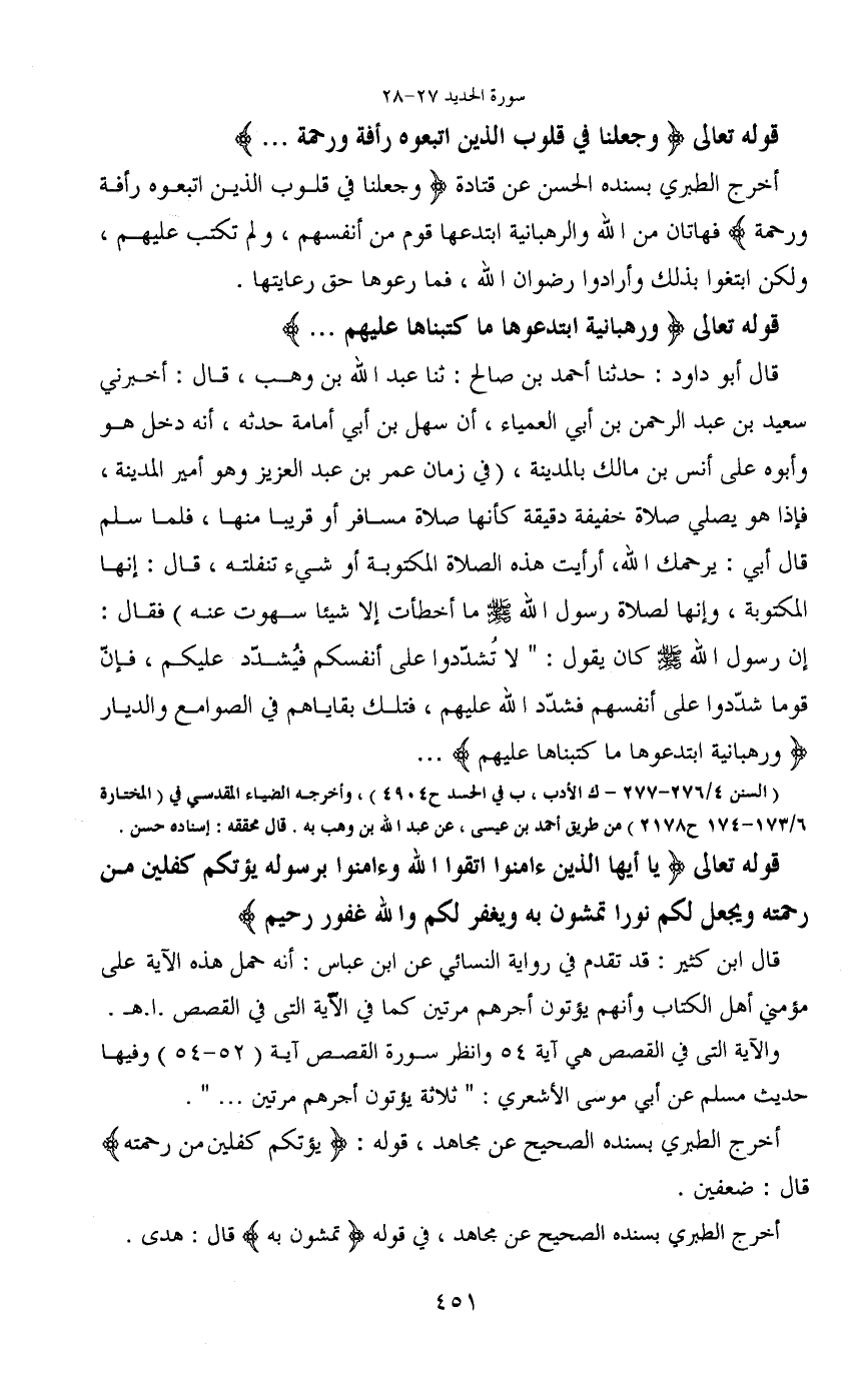أخرج الطبري بسنده الحسن عن قتادة (وَجَعَلْنَا فِي قُلُوبِ الَّذِينَ اتَّبَعُوهُ رَأْفَةً وَرَحْمَةً) فهاتان من الله والرهبانية ابتدعها قوم من أنفسهم، ولم تكتب عليهم، ولكن ابتغوا بذلك وأرادوا رضوان الله، فما رعوها حق رعايتها.