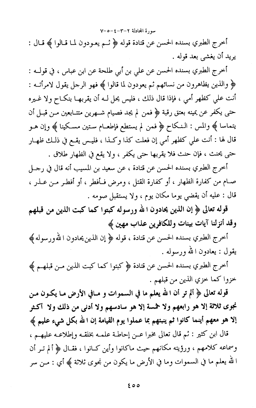 قال ابن كثير: ثم قال تعالى مخبرا عن إحاطة علمه بخلقه وإطلاعه عليهم، وسماعه كلامهم، ورؤيته مكانهم حيث ما كانوا وأين كانوا، فقال (ألم تر أن الله يعلم ما في السماوات وما في الأرض ما يكون من نجوى ثلاثة) أي: من سر