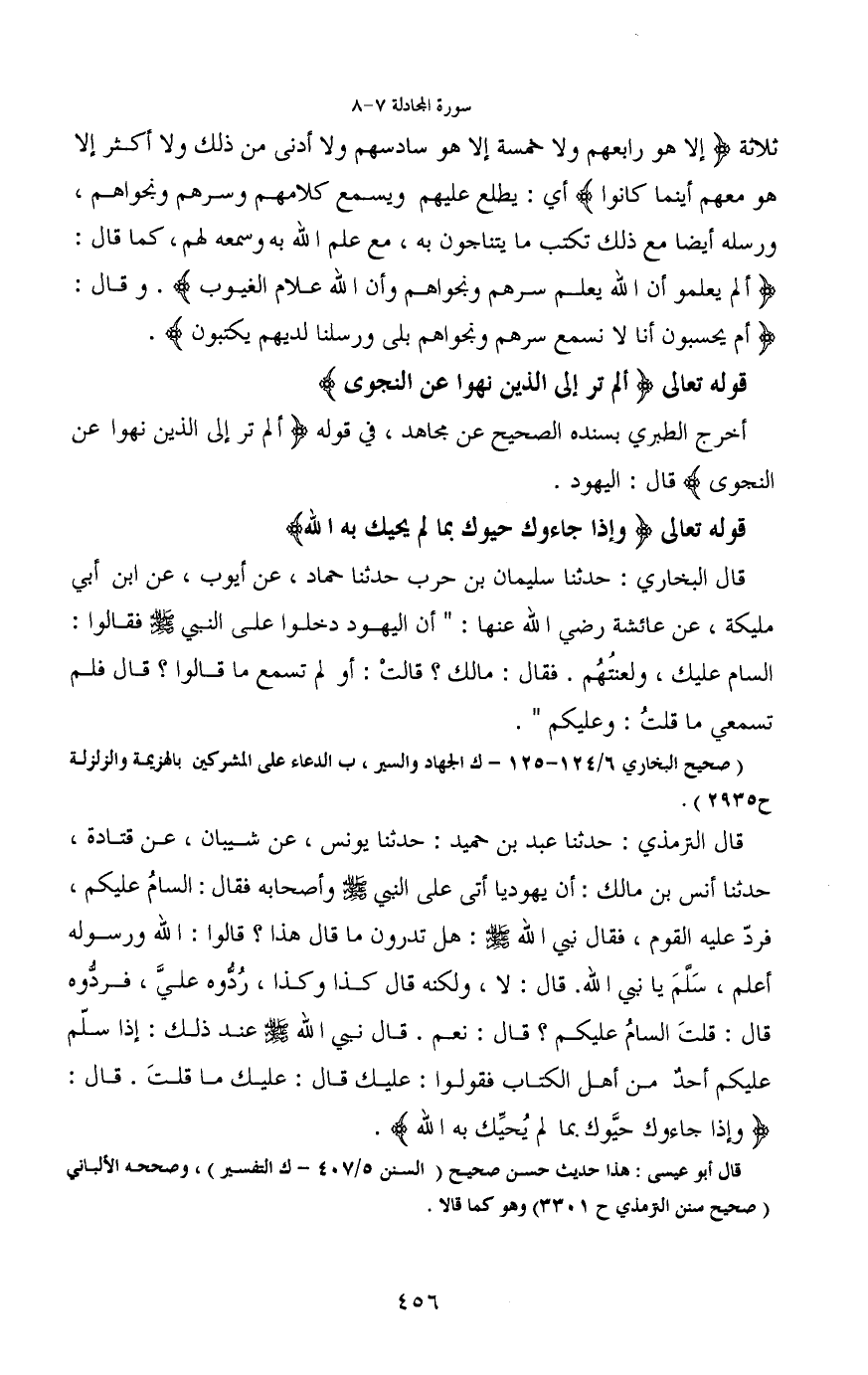 قال الترمذي: حدثنا عبد بن حميد: حدثنا يونس، عن شيبان، عن قتادة، حدثنا أنس بن مالك: أن يهوديا أتى على النبي - صَلَّى اللَّهُ عَلَيْهِ وَسَلَّمَ - وأصحابه فقال: السامُ عليكم، فردّ عليه القوم، فقال نبي الله - صَلَّى اللَّهُ عَلَيْهِ وَسَلَّمَ -: هل تدرون ما قال هذا؟ قالوا: الله ورسوله أعلم، سَلّمَ يا نبي الله. قال: لا، ولكنه قال كذا وكذا، رُدُّوه عليَّ، فردُّوه قال: قلتَ السامُ عليكم؟ قال: نعم. قال نبي الله - صَلَّى اللَّهُ عَلَيْهِ وَسَلَّمَ - عند ذلك: إذا سلّم عليكم أحدٌ من أهل الكتاب فقولوا: عليك قال: عليك ما قلتَ. قال: (وإذا جاءوك حيَّوك بما لم يُحيِّك به الله) .